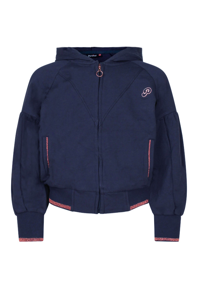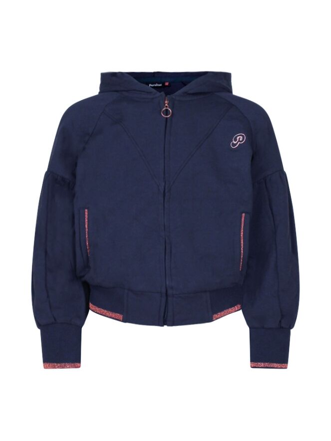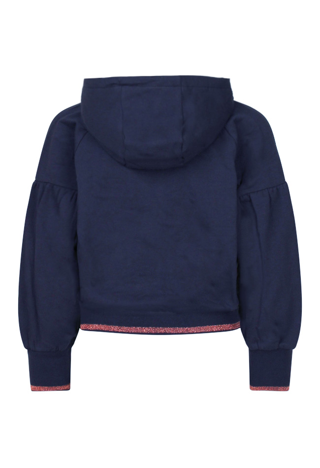 Vest met capuchon, ballonmouwen en rekbare boord aan de onderzijde. Kleine glitter details bij de zakjes, onder aan de boord van de mouwen en aan de onderzijde van de boord.