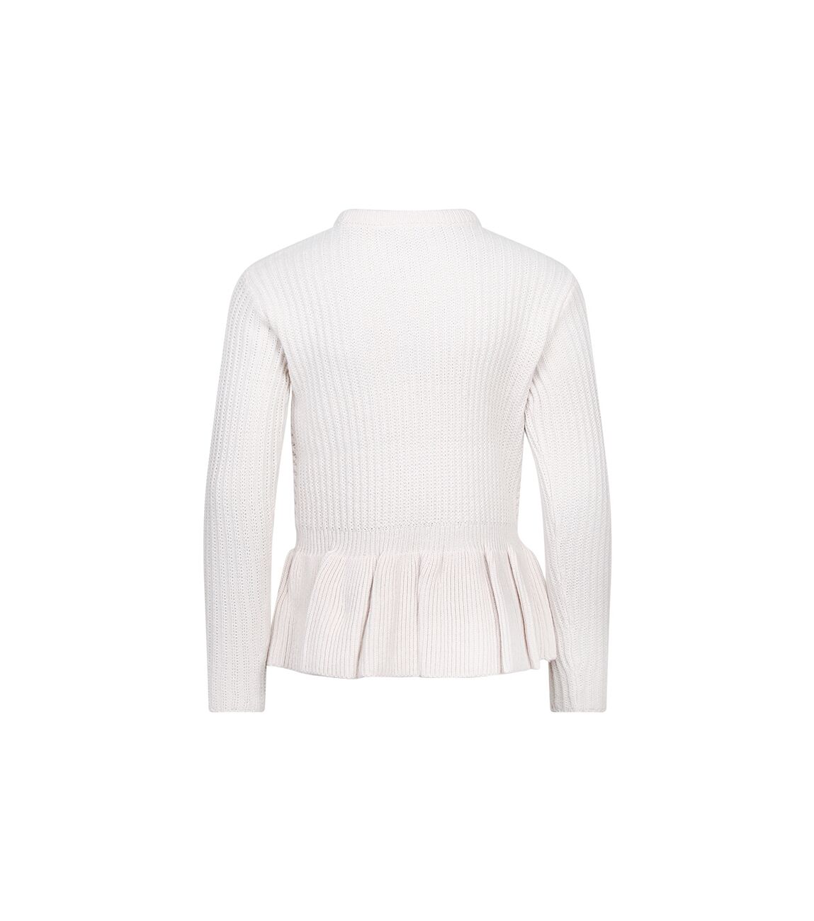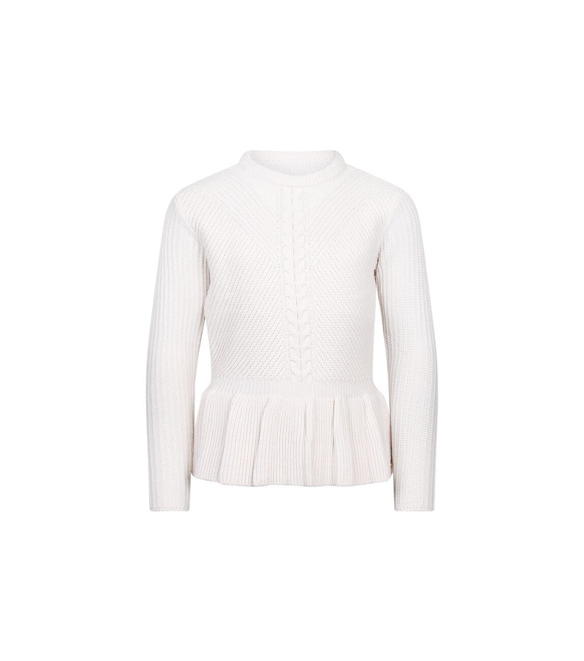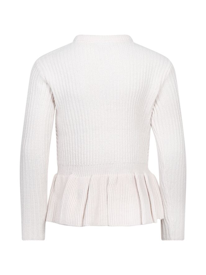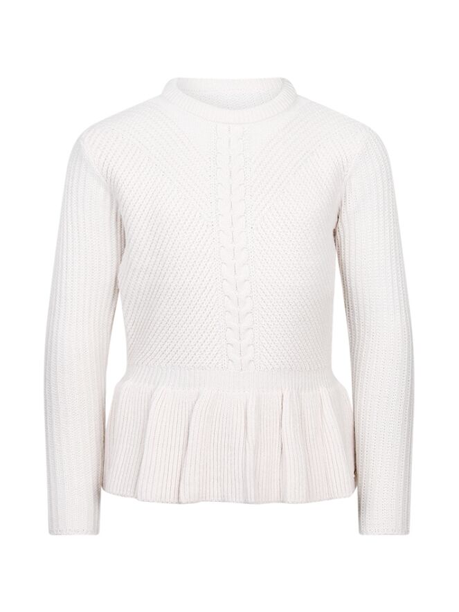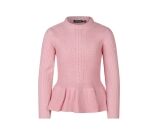 Deze trui voor meisjes heeft een ribbrei patroon. Het ondereind van de trui heeft plooien en vormt een zogeheten schootje.