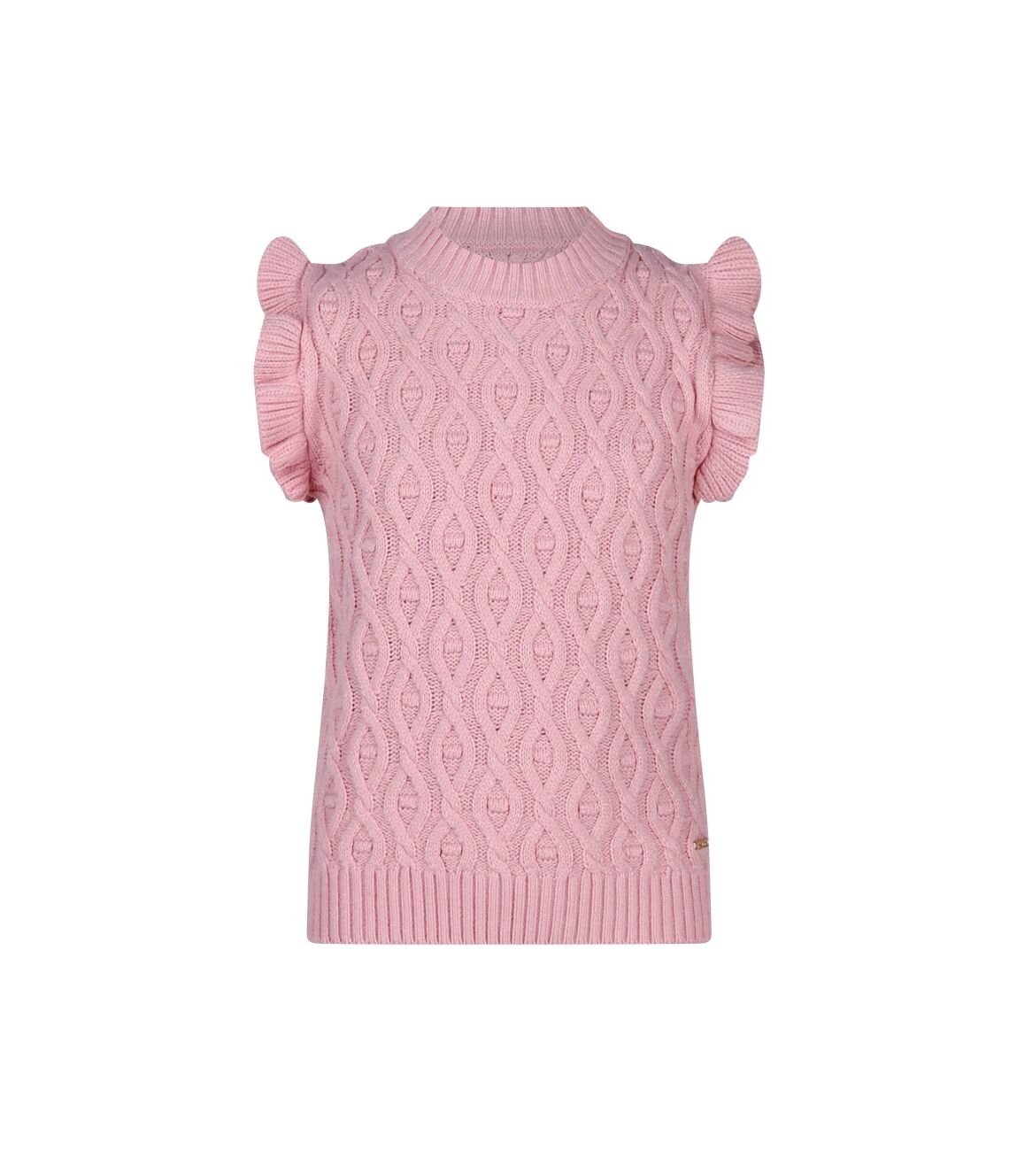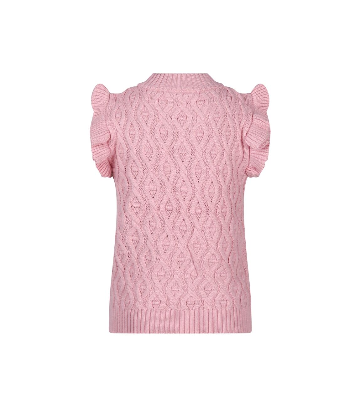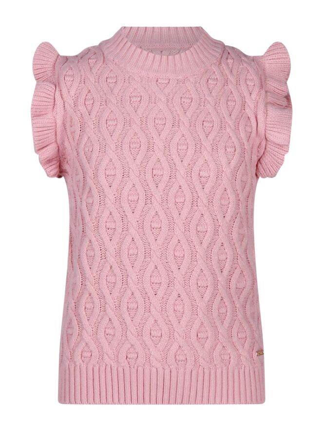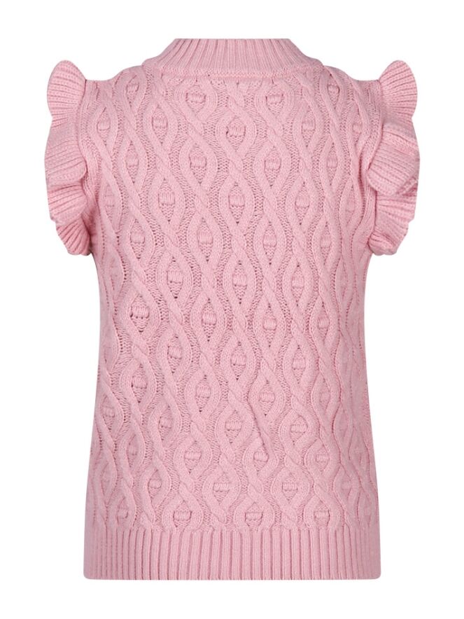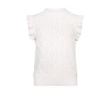 Spencer met kabelpatroon en gebreide ruche over de schouder.