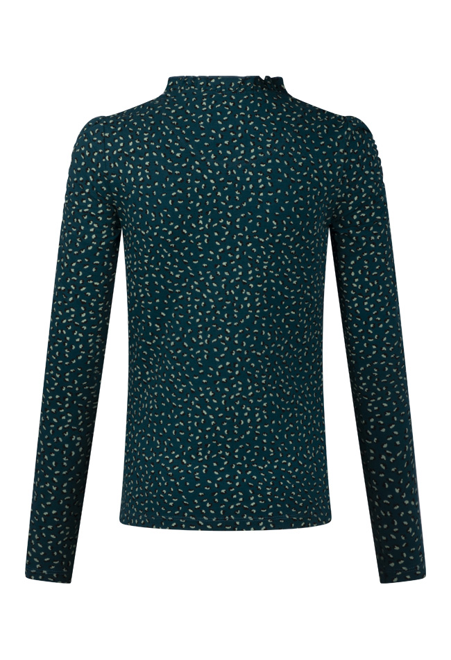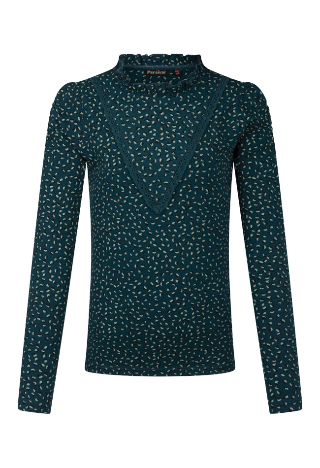 T-shirt met lange mouwen heeft een uniek rimpel detail op de schouders en een elegant opstaand roezelkraagje. Het is bedrukt met een prachtige all-over bloementjes print. Het kanten detail aan de voorzijde voegt een vleugje romantiek en verfijning toe aan het geheel.