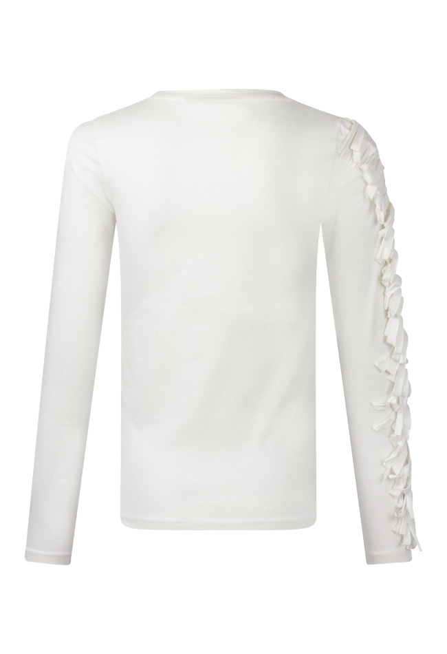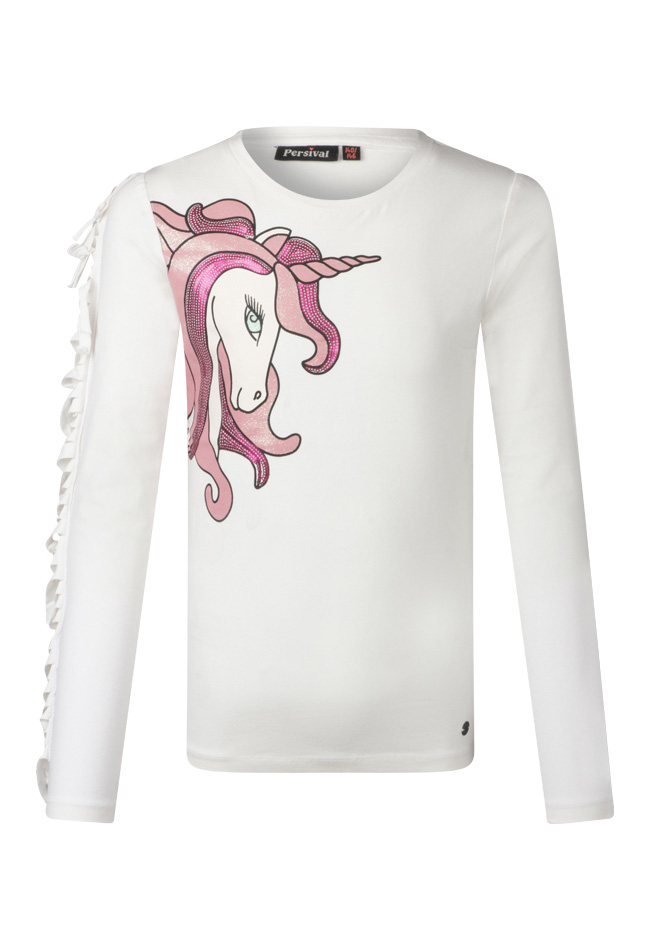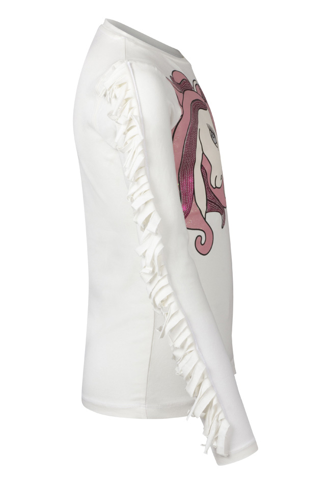 Shirt met lange mouwen voor meisjes met een ronde hals en unicorn print met glitters en pailletten. Op de rechter mouw zitten franjes, dit zijn de manen van de unicorn!
