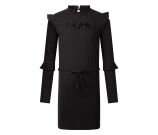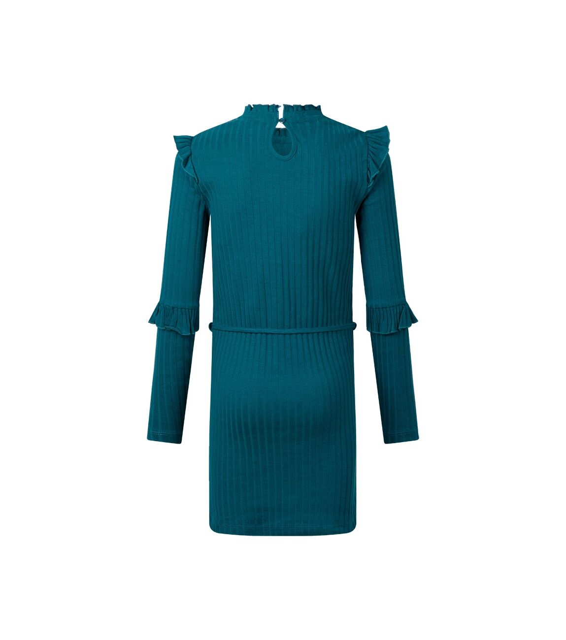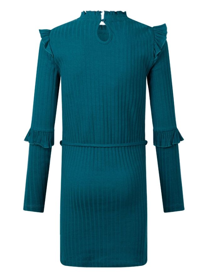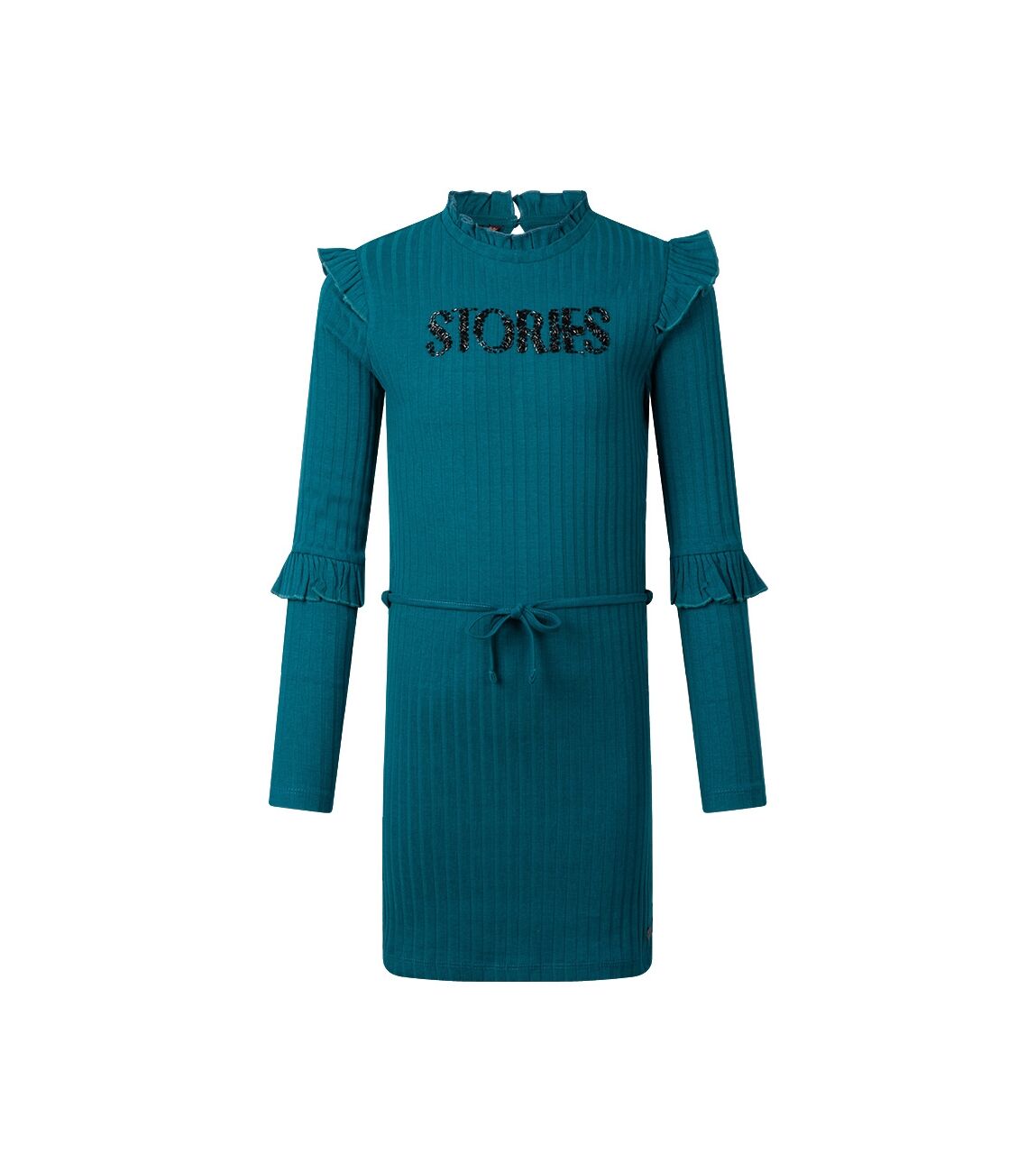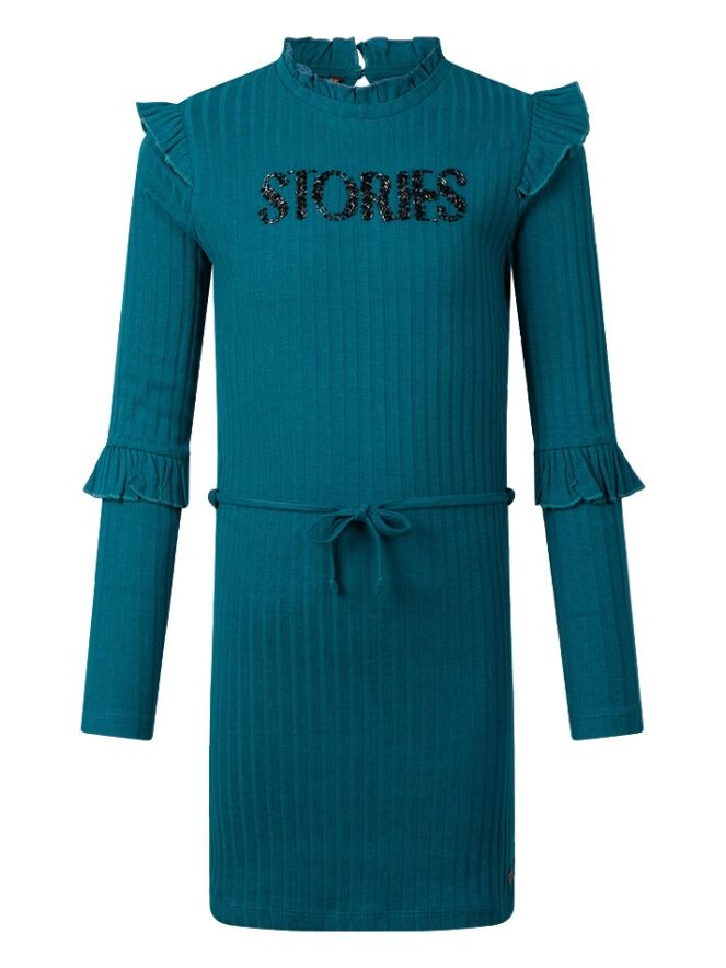 Dit jurkje met breed rib patroon heeft diverse ruches en een kraaltjes tekst voorop. In de middel heeft dit jurkje een ceintuurtje.