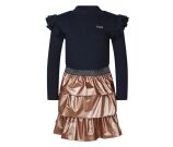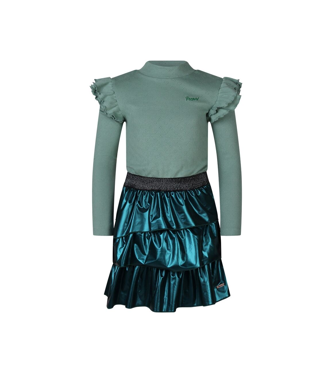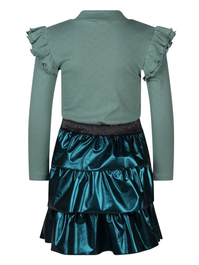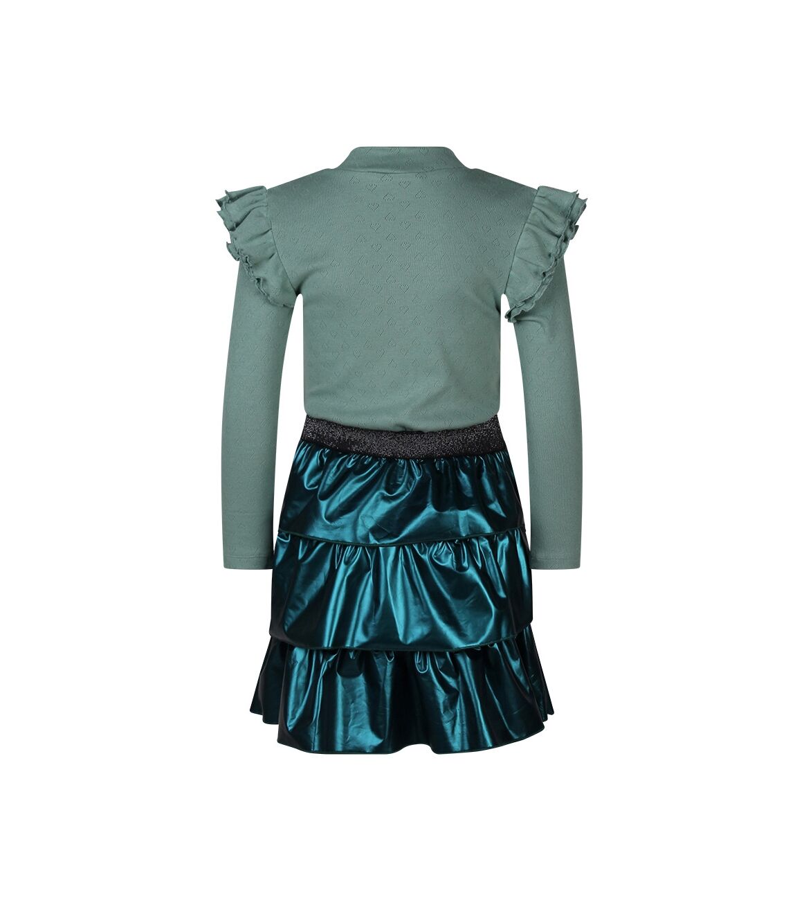 Jurk met lange mouwen en een turtleneck. Op de schouders zit een dubbele laag roezels. Het bovenste gedeelte is gemaakt van een ajour gebreide jersey met hartjes design, de taille is voorzien van een elastieken glitter band voor comfortabele pasvorm. De stroken rok is gemaakt van imitatie leer. Attentie: Dit artikel is gemaakt van een delicaat materiaal en is gevoelig voor beschadiging. Was het artikel apart en binnenstebuiten of in een waszakje. Wees extra voorzichtig met scherpe artikelen, zoals sieraden.