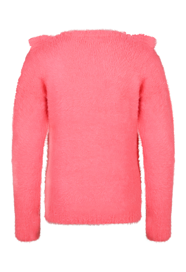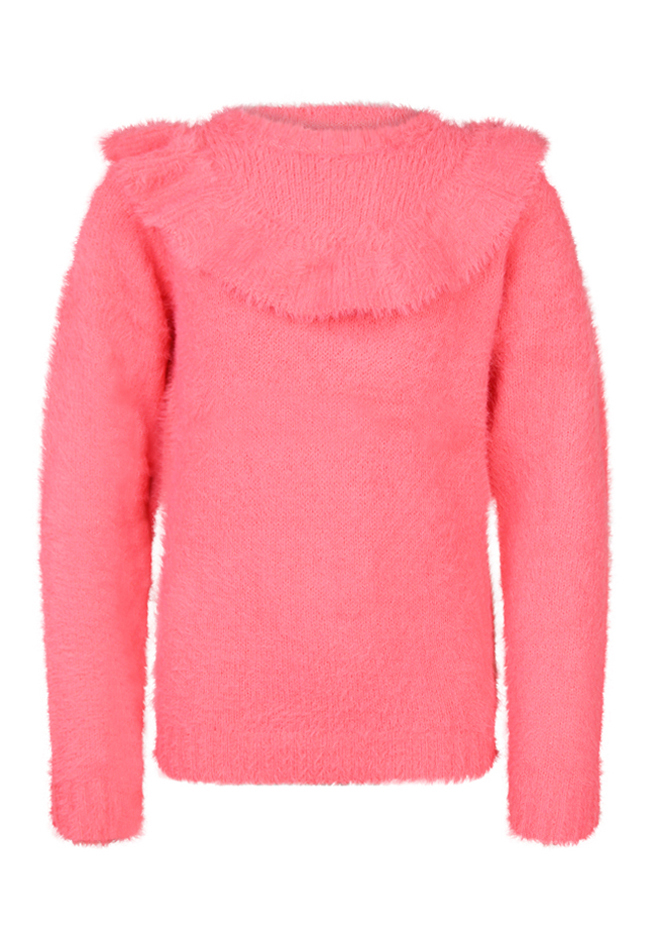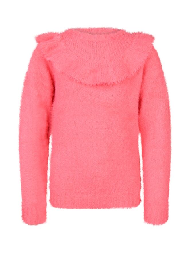 Deze trui met ronde hals voor meisjes heeft een ruche voor de hals. Voor het breisel is featheryarn gebruikt, dit zorgt voor een zachte pluis over de trui.