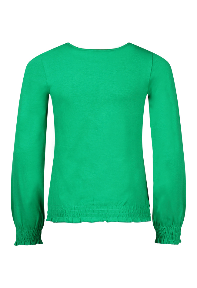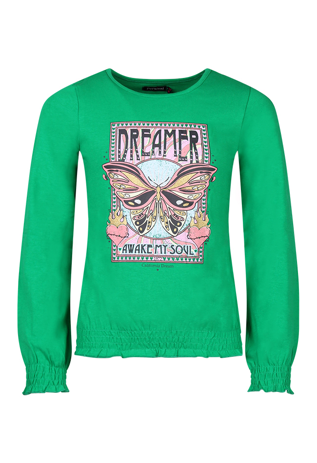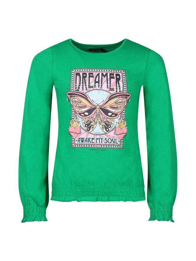 Comfortabele T-shirt met lange mouwen en een ronde hals. De boorden zijn gemaakt van elastisch smokwerk, wat zorgt voor een trendy en aansluitende pasvorm. Op de voorkant van het T-shirt bevindt zich een geplaatste print van een prachtige vlinder.