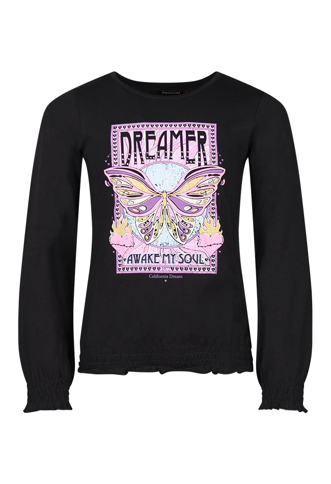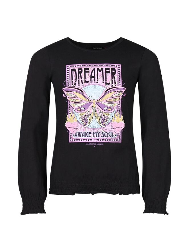 Comfortabele T-shirt met lange mouwen en een ronde hals. De boorden zijn gemaakt van elastisch smokwerk, wat zorgt voor een trendy en aansluitende pasvorm. Op de voorkant van het T-shirt bevindt zich een geplaatste print van een prachtige vlinder.
