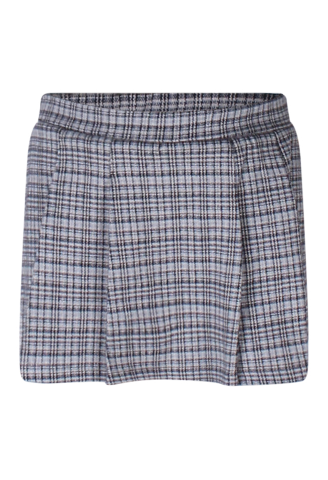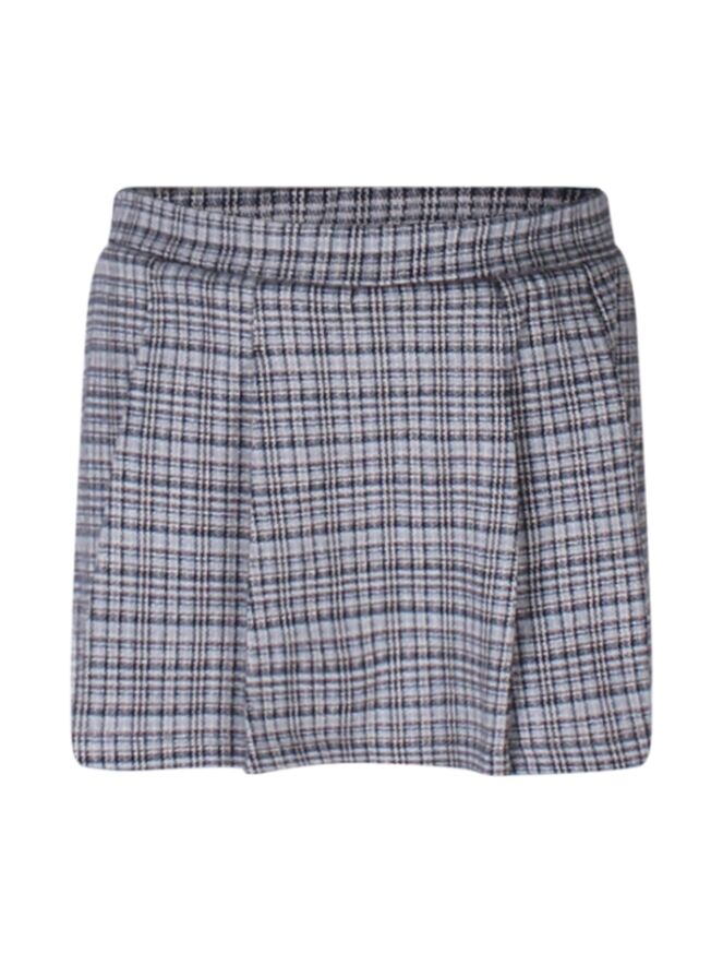 geruite skort met lurex details, plooirok voor en broekje achter, elastische tailleband.