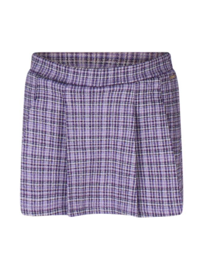 geruite skort met lurex details, plooirok voor en broekje achter, elastische tailleband.