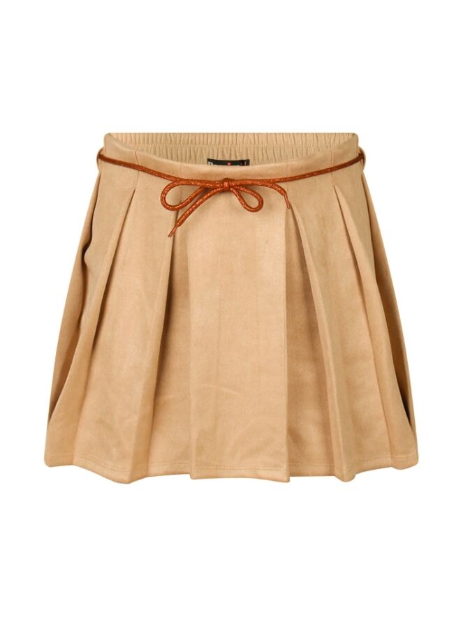 Leuke skort van suedine. Short skort is aan de voorkant een geplooid rokje maar is eigenlijk gewoon een kort broekje. De suedine is super zacht en het bijgeleverde koordje maakt het helemaal af! Maar je kan er ook voor kiezen om hem er af te laten.