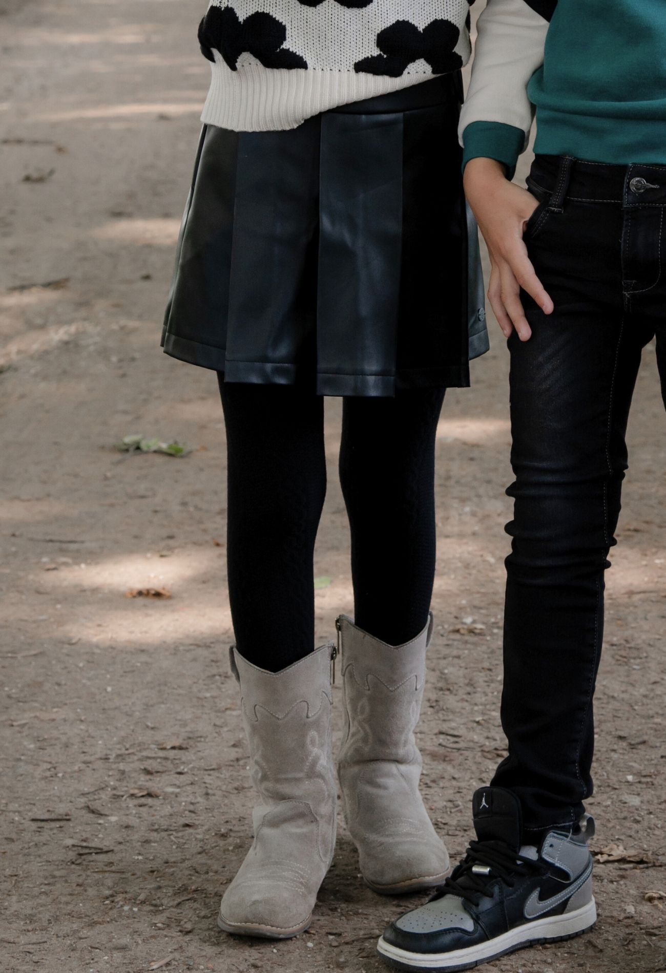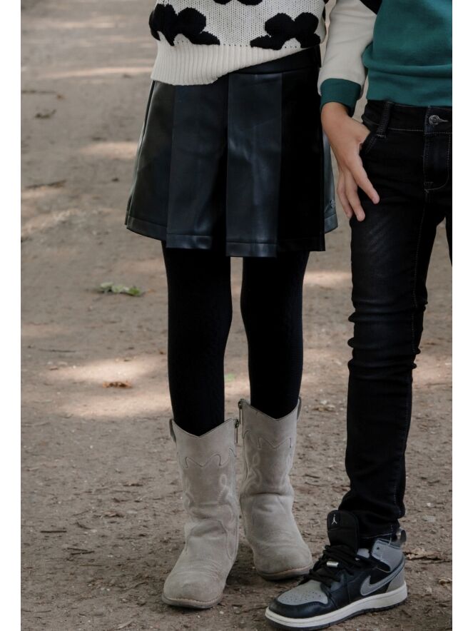 Deze skort van imitatie fake leer is aan de voorkant een rokje maar is eigenlijk gewoon een korte broek. Aan de voorkant zitten er plooien vanuit de taille met een hartvormige gesp met achterop in de taille elastiek. Leuker wordt het niet dus vergeet deze niet! Net een maatje kleiner nodig? Van bakkaboe zijn ze er ook! W90164