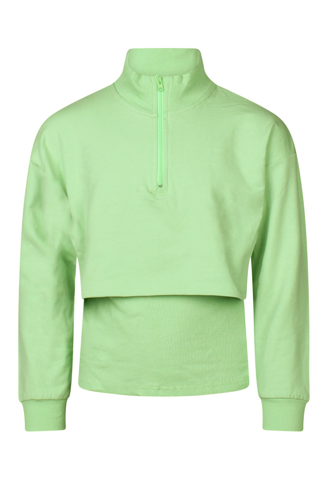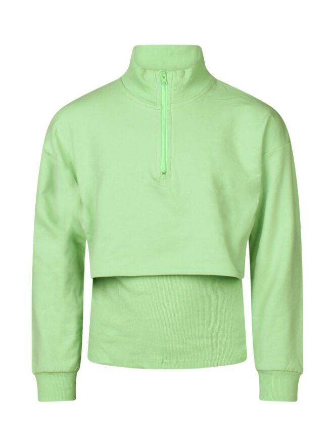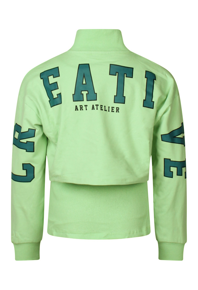 Creative art atelier! Deze sweater is net even anders. Dat komt omdat hij 2 delig is! Er zit een hemdje van ribstof (vast) onder de crobbed sweater. Heb je al de print op de rug van de sweater gezien? Trendy Musthave!