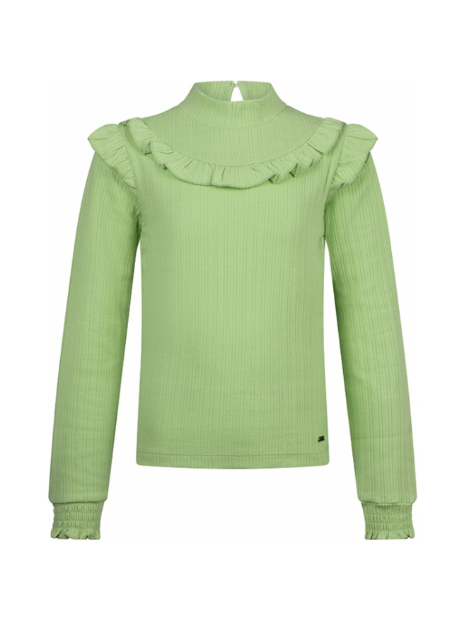 Dit fijne shirt met lage col draagt ontzettend lekker door de elastische stof. Met de leuke ruches op de schouder en over de halslijn ben jij super trendy! Extra detail is de druppeluitsparing achterop het shirt. Het uiteinde van de mouw is met elastiek voor een speels effect.