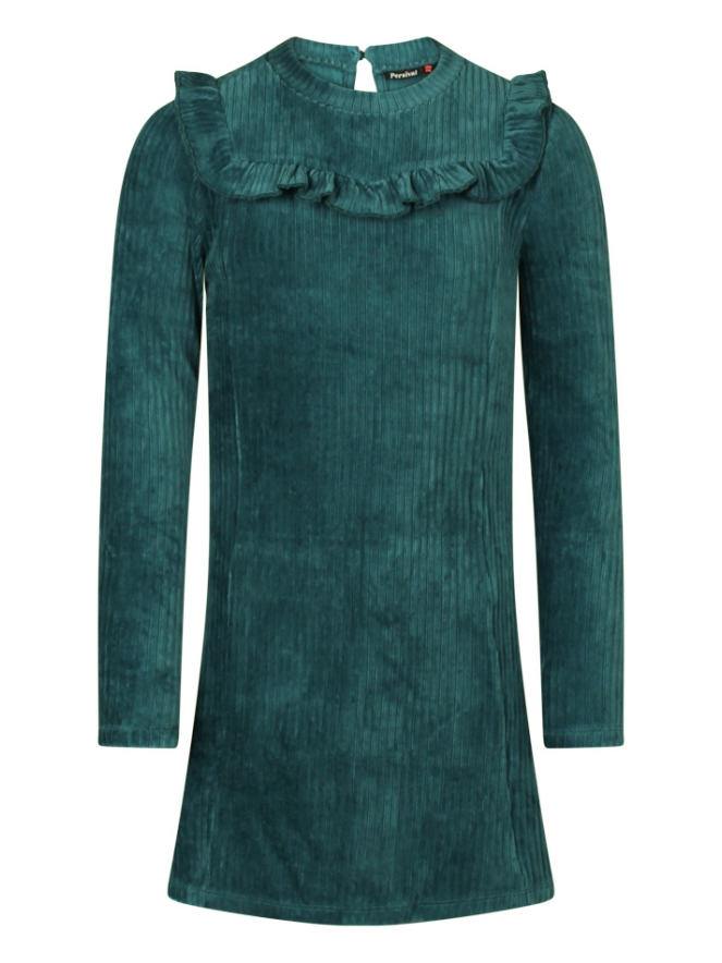 Deze meisjes jurk heeft een opstaande kraag en is gemaakt van zachte velvet ribstof. Ruches over de borst en schouders geven het een speels detail, terwijl het uitlopende model zorgt voor een comfortabele pasvorm.