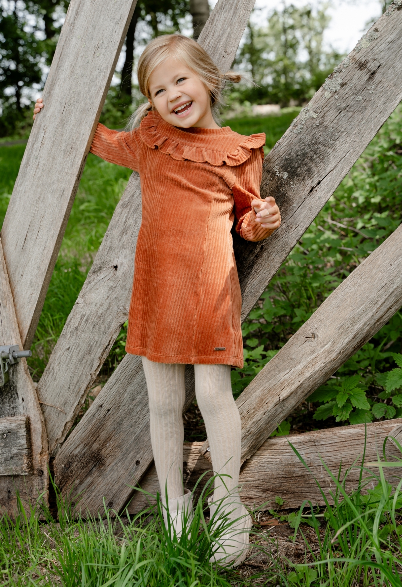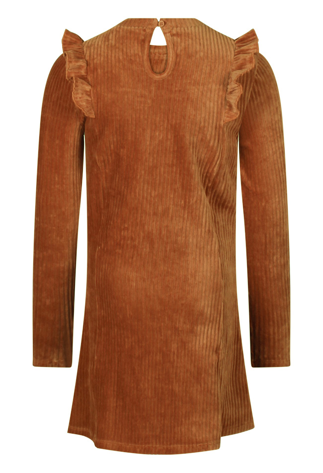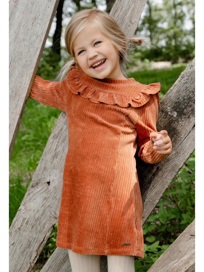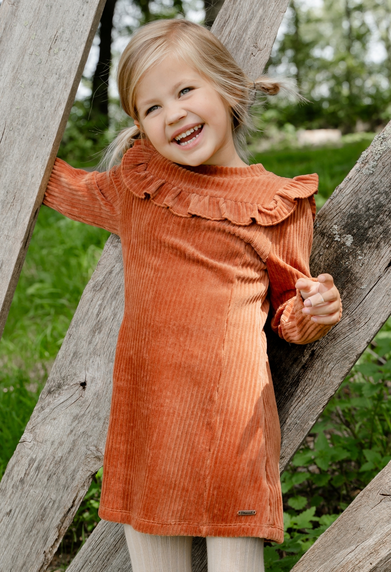 Deze meisjes jurk heeft een opstaande kraag en is gemaakt van zachte velvet ribstof. Ruches over de borst en schouders geven het een speels detail, terwijl het uitlopende model zorgt voor een comfortabele pasvorm.