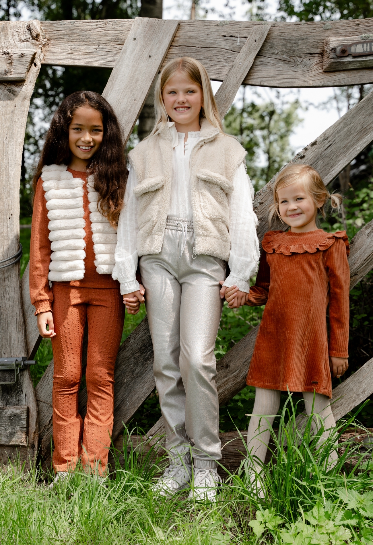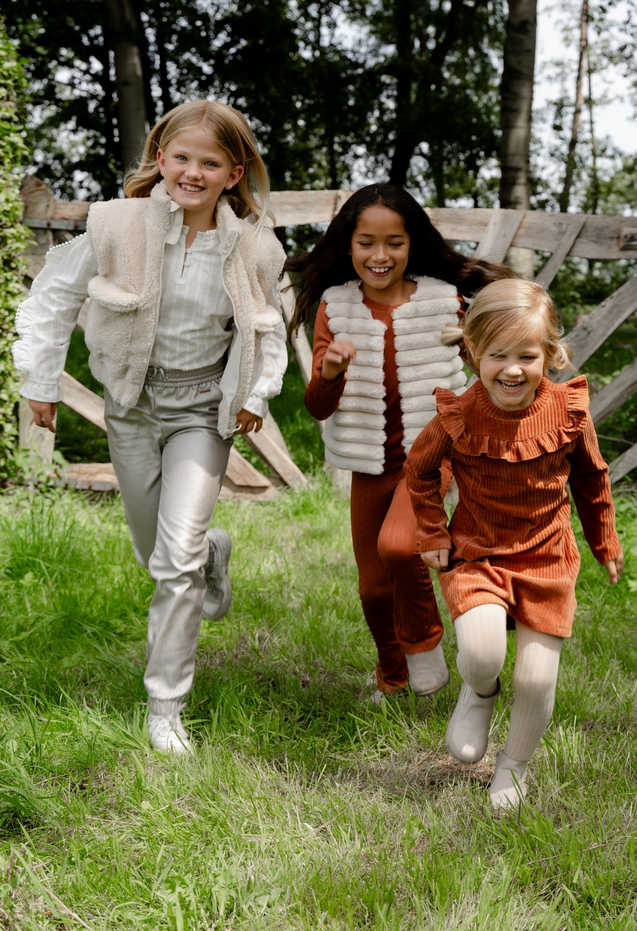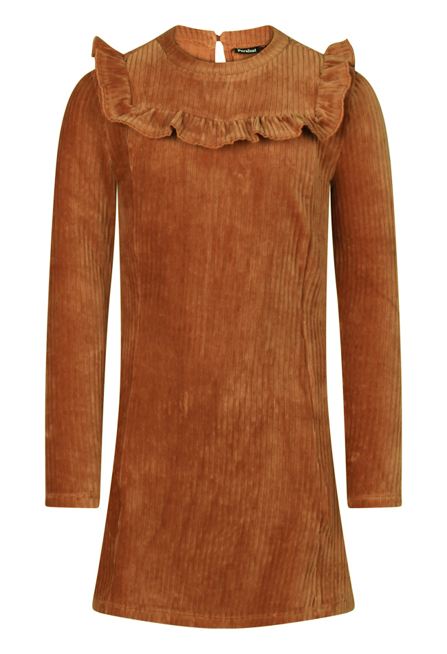 Deze meisjes jurk heeft een opstaande kraag en is gemaakt van zachte velvet ribstof. Ruches over de borst en schouders geven het een speels detail, terwijl het uitlopende model zorgt voor een comfortabele pasvorm.