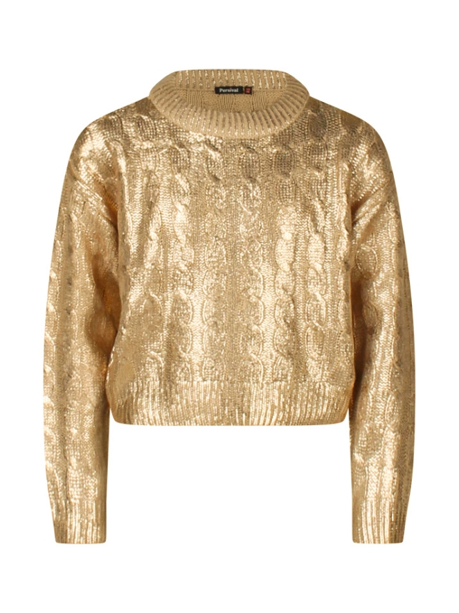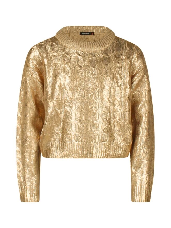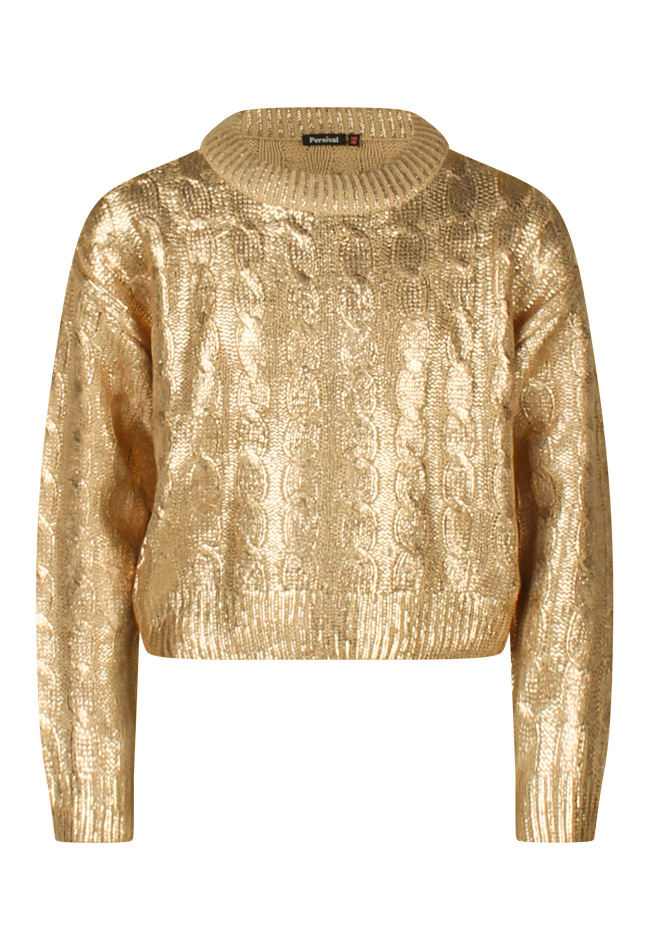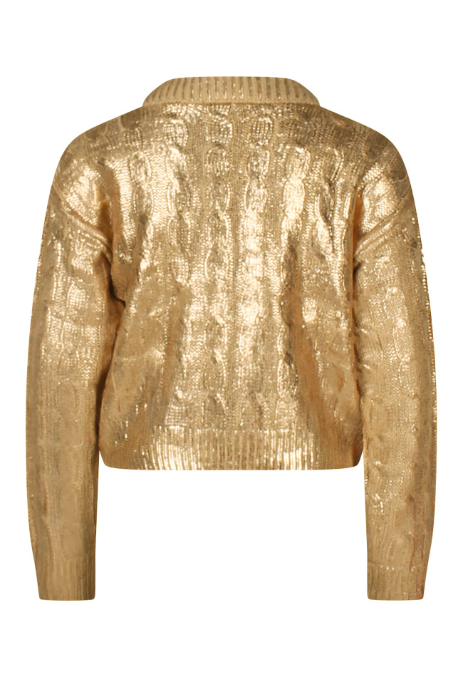 Shiny bling bling! Met deze trui val jij echt op! Dit blikvangertje is een kabeltrui met zilver of gouden coating. Let op, is een korter cropped model. Super leuk op een gewone spijkerbroek.