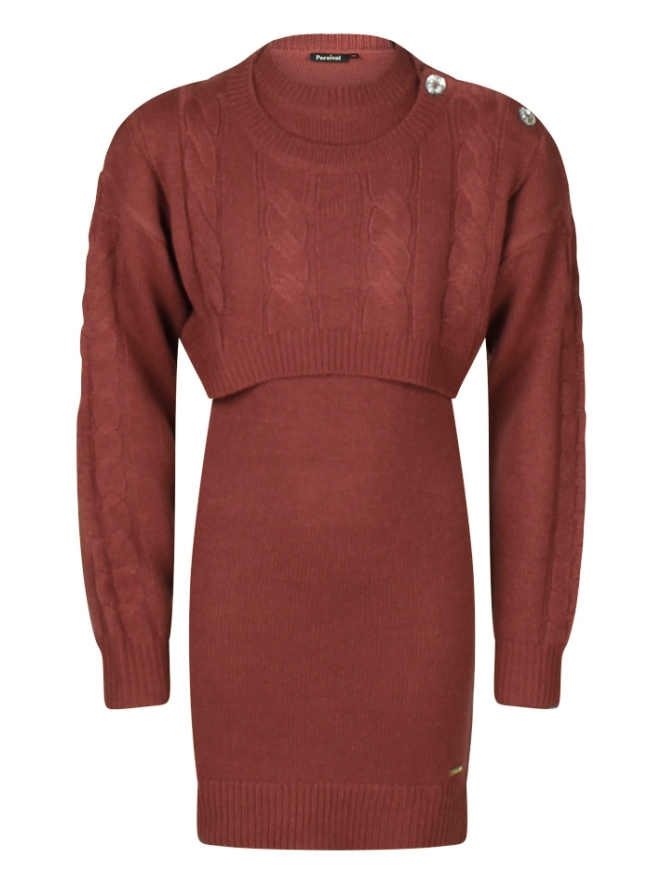 Dit gebreide winterjurkje is even anders als anders! En dat maakt hem nou net zo leuk! 2 Delig en los vanelkaar te dragen maar als co-ord set nog leuker! Het jurkje zelf heeft korte mouwen maar met de korte trui erover maar je er een jurkje van met lange mouw! De trui heeft een mooi kabelpatroon met op 1 schouder twee glimmende knopen!