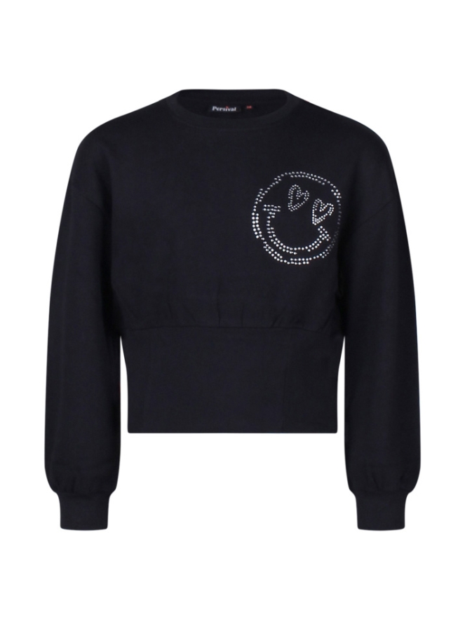 Deze meisjes sweater heeft brede boorden en een strass smiley op de borst.
