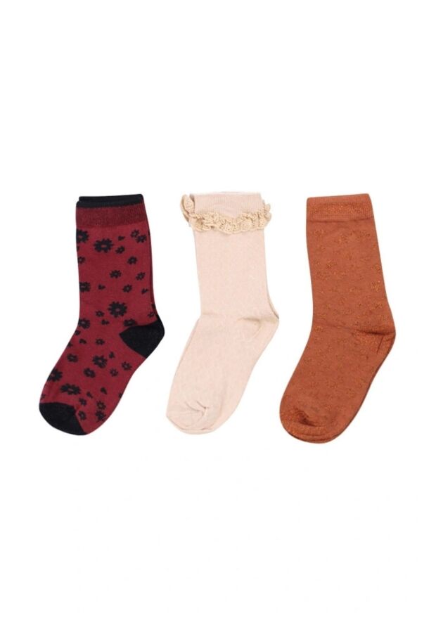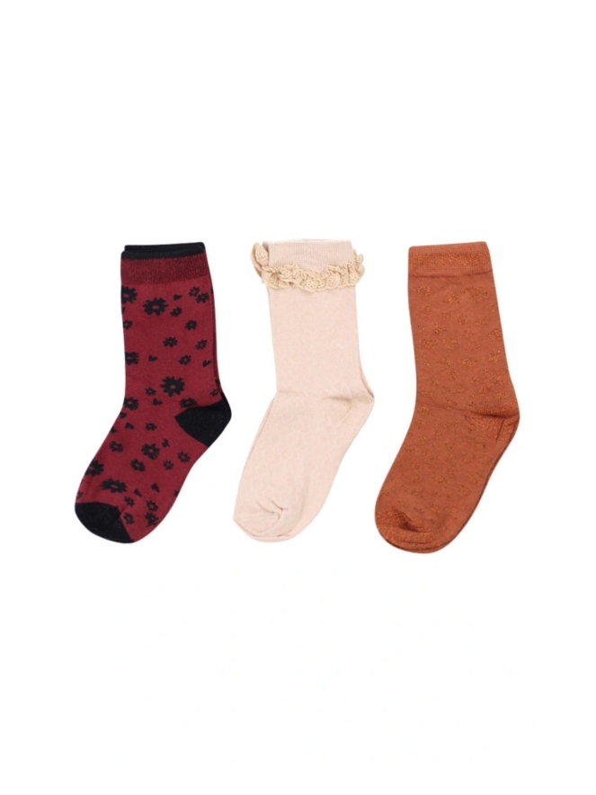 Set van drie paar sokken met verschillende printjes: bloemen, panter en ruitpatroon. Twee paar zijn voorzien van glitters in de vorm van lurexdraad.