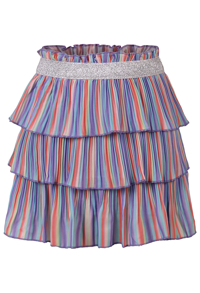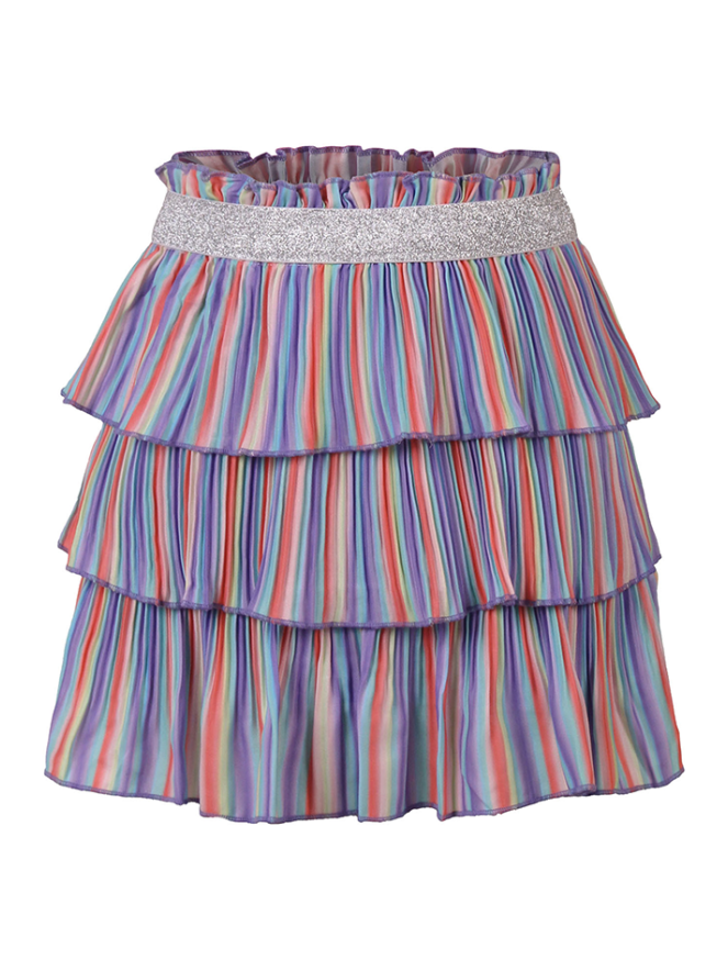 Op zoek naar een vrolijke en trendy meisjes rok? Deze plissé rok van Persival met kleurrijke regenboogprint is een echte must-have voor elke meisjesgarderobe. De speelse print en luchtige stof maken deze rok perfect voor zowel dagelijkse outfits als feestelijke momenten. De rok is gemaakt van een soepele crêpe stof met een zachte katoenen voering, waardoor hij niet alleen mooi valt maar ook comfortabel draagt. De plissé afwerking zorgt voor een speels en zwierig effect bij elke beweging. Dankzij de elastische tailleband trek je de rok makkelijk aan en zit hij altijd fijn. De mini lengte geeft de rok een frisse, zomerse uitstraling en maakt hem ideaal om te combineren met een T-shirt, top of blouse.