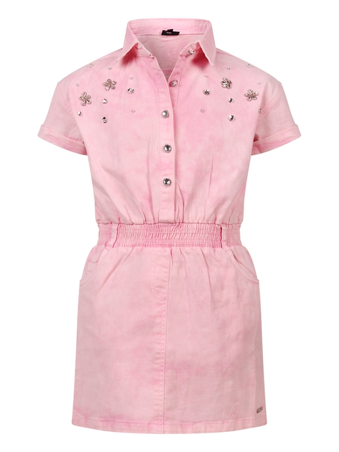 Stijlvolle meisjesjurk met een speelse en comfortabele pasvorm. De korte omslagmouwtjes geven de jurk een casual en trendy uitstraling. Subtiele strassdetails zorgen voor een sprankelend accent, perfect voor een feestelijke touch. De elastische band in de taille zorgt voor een mooie pasvorm en extra draagcomfort. Ideaal voor zowel alledaagse momenten als speciale gelegenheden.