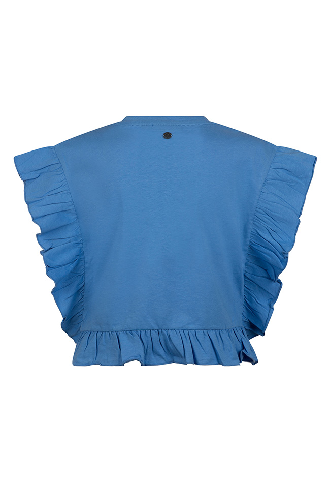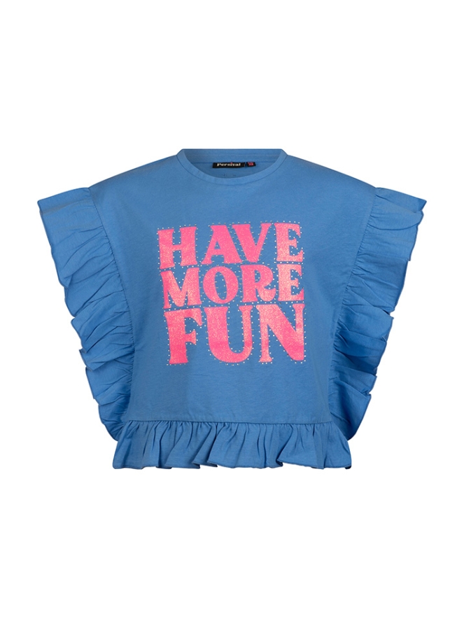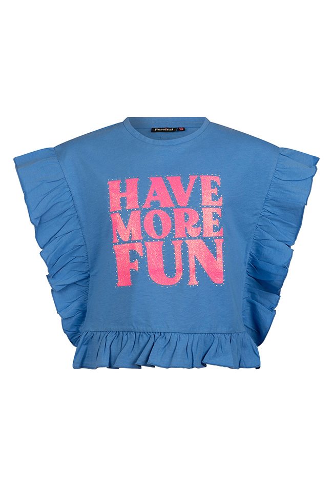 Vrolijk meisjes shirt met een ronde hals en een speelse uitstraling. De glitterprint met strass â??Have more Funâ? zorgt voor een opvallend en trendy accent. De ruches in de mouwen en langs de taille geven het shirt een extra girly en sierlijk effect. Gemaakt van zacht en comfortabel materiaal, perfect voor elke dag. Leuk te combineren met een rokje, short of jeans voor een stralende outfit.