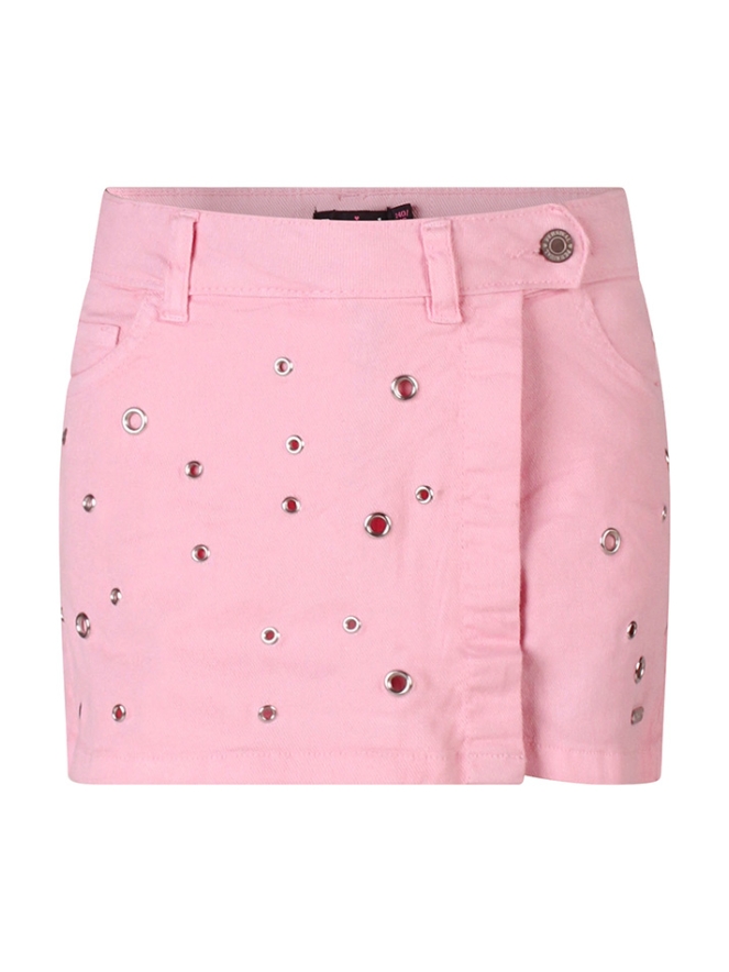 Dit stoere meisjes broekrokje van Persival is een perfecte mix van trendy en comfortabel. De skort is gemaakt van stevige twill stof met een lichte stretch, waardoor hij fijn zit en ideaal is voor dagelijks gebruik. Het model heeft een speelse overslag met opvallende nestelringen, wat zorgt voor een hip en uniek detail. De 5-pocket uitvoering en de rits- en knoopsluiting geven de rok een stoere uitstraling. Dankzij de verstelbare tailleband zit de rok altijd goed en kan hij makkelijk aangepast worden. De mini lengte maakt deze rok perfect voor warmere dagen en leuk te combineren met een T-shirt, top of sweater.