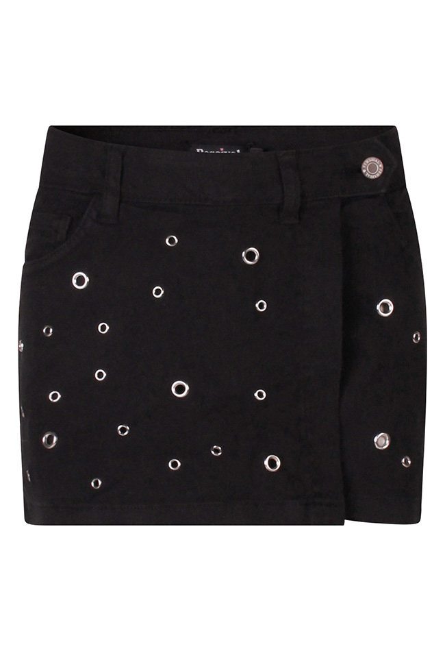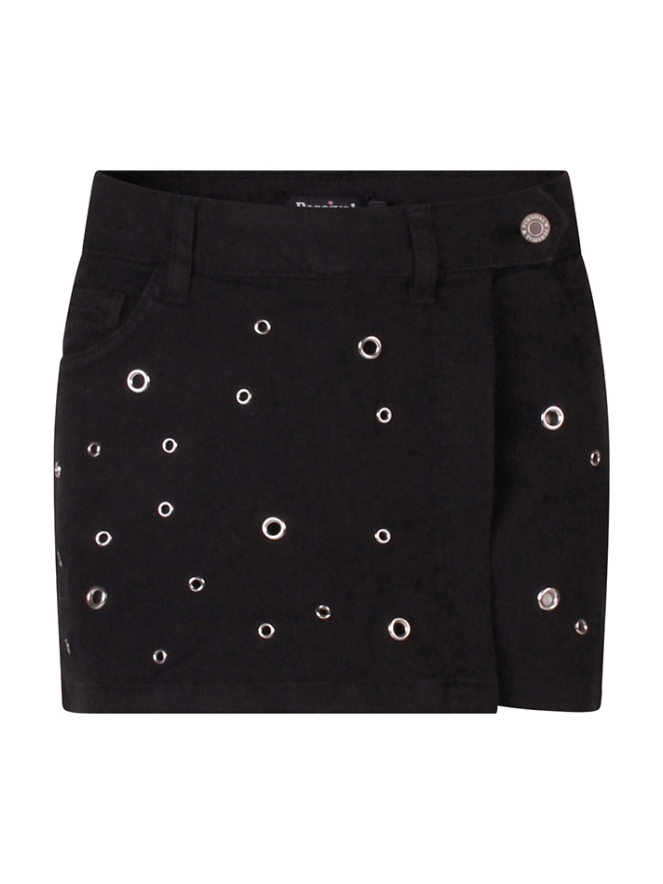Dit stoere meisjes broekrokje van Persival is een perfecte mix van trendy en comfortabel. De skort is gemaakt van stevige twill stof met een lichte stretch, waardoor hij fijn zit en ideaal is voor dagelijks gebruik. Het model heeft een speelse overslag met opvallende nestelringen, wat zorgt voor een hip en uniek detail. De 5-pocket uitvoering en de rits- en knoopsluiting geven de rok een stoere uitstraling. Dankzij de verstelbare tailleband zit de rok altijd goed en kan hij makkelijk aangepast worden. De mini lengte maakt deze rok perfect voor warmere dagen en leuk te combineren met een T-shirt, top of sweater.
