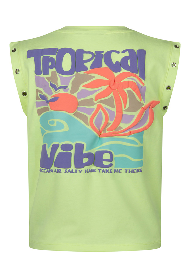 Deze vrolijke meisjes singlet brengt je meteen in tropische sferen. De frisse kleuren en zomerse look maken dit het perfecte item voor zonnige dagen. De eyecatcher? De stijlvolle rugprint met de tekst Ocean air, salty hair, take me there. Ideaal voor kleine strandliefhebbers en avonturiers. De speelse nestels in het armgat geven de top een trendy en unieke twist.