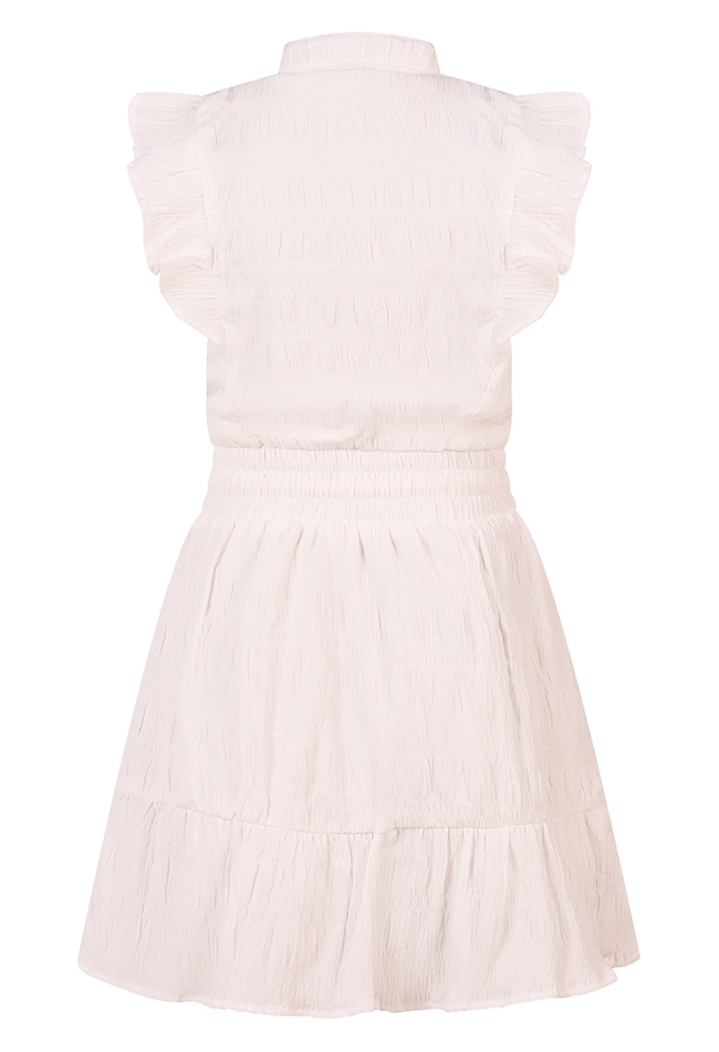 Vrolijk zomers jurkje met een kapmouwtje, strikje in de taille en diverse ruche en crincle details.