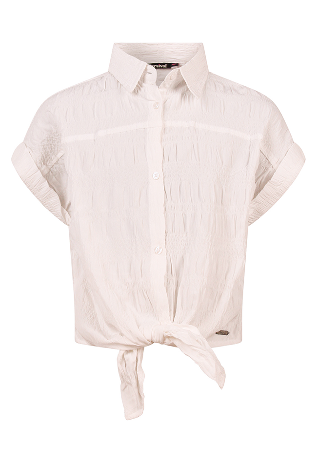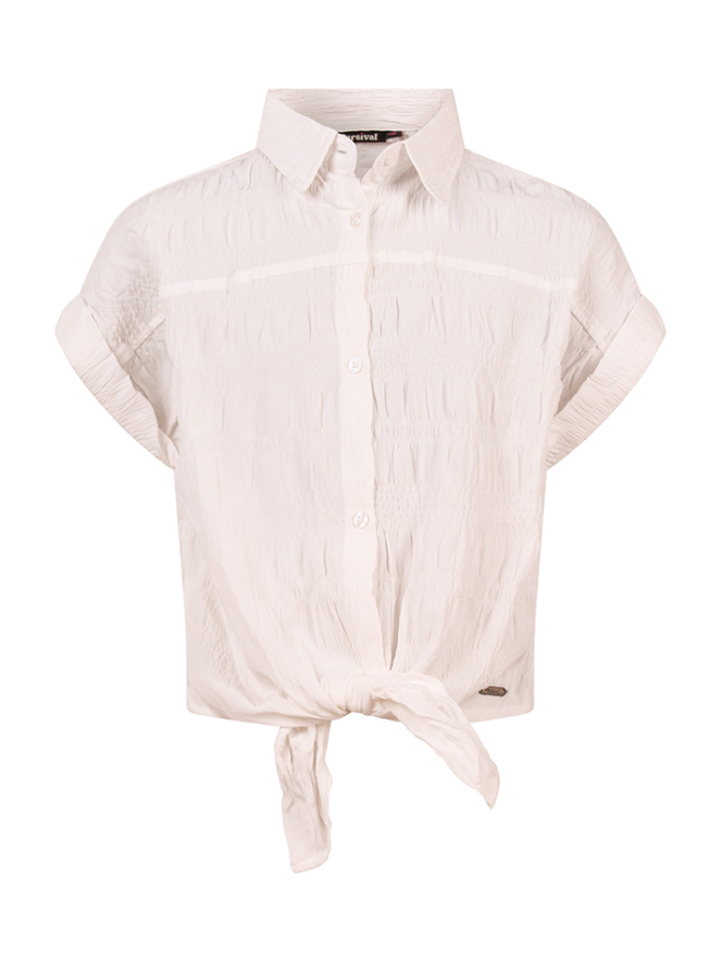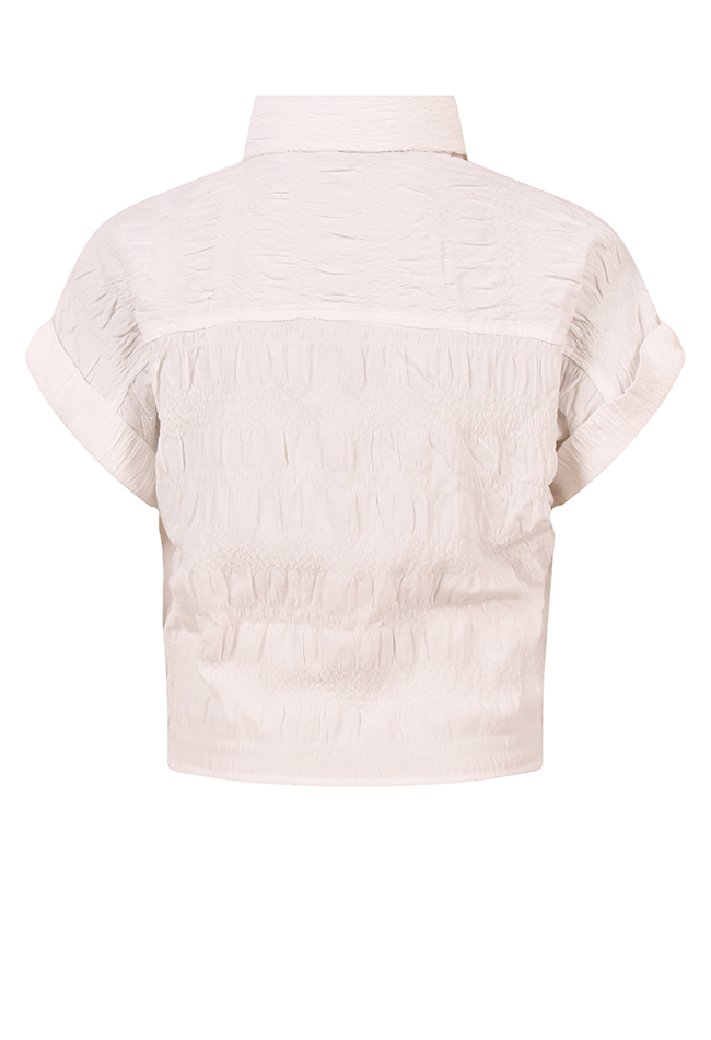 Stijlvolle knoopblouse voor meisjes met een speelse en moderne uitstraling. Deze blouse is gemaakt van een luchtige crinkle stof, wat zorgt voor een subtiele gekreukte look en extra comfort. De omslagmouwen geven het geheel een nonchalante en trendy touch.