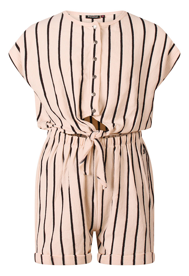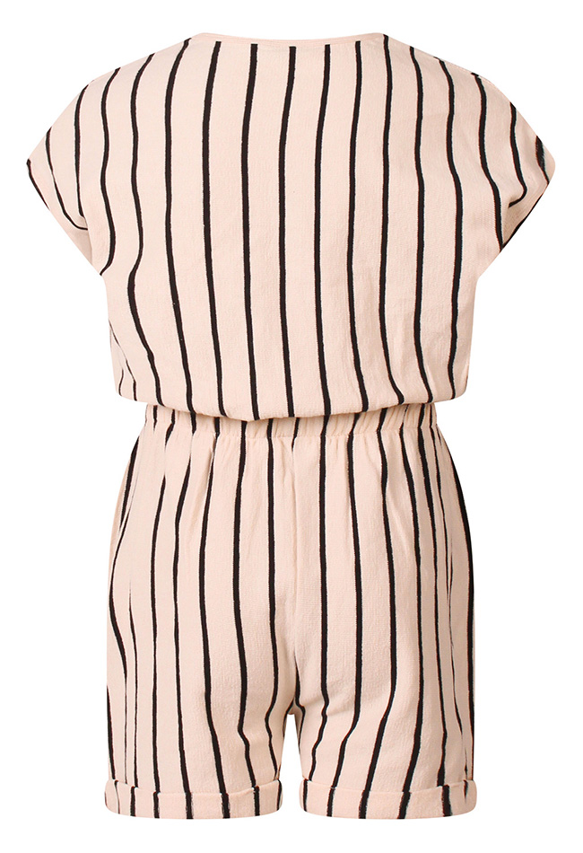 Jumpsuit met een flatterend verticaal streeppatroon en een knoopdetail in de taille voor een mooi silhouet. Sluiting is door middel van knoopjes. Het model heeft korte mouwen, een ronde hals en een short, wat zorgt voor een luchtige en comfortabele look met een stijlvolle uitstraling.