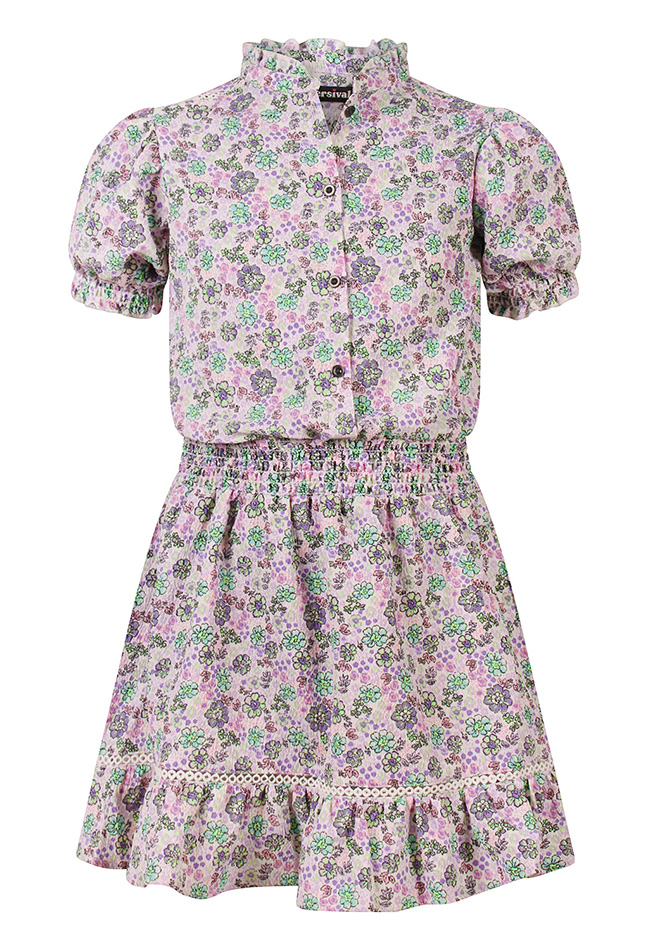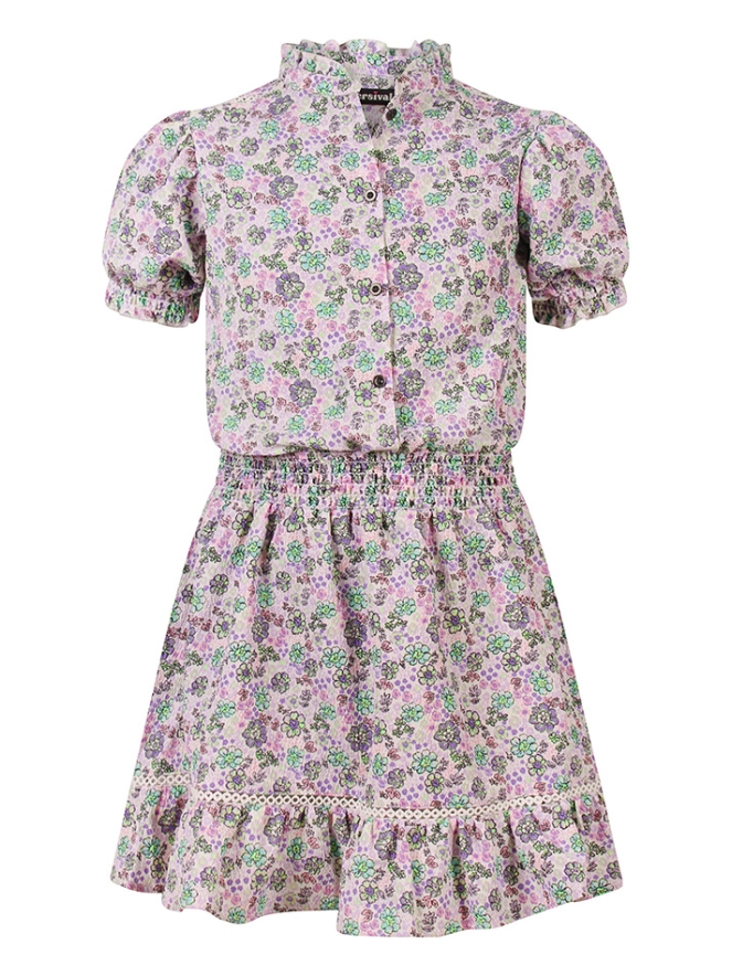 Deze schattige meisjesjurk van Persival is perfect voor feestjes of een vrolijke zomerse outfit. De jurk is gemaakt van zachte crinkle stof (98% polyester, 2% elastaan) die comfortabel draagt en mooi valt. Het opvallende bloemdessin in roze en violet geeft de jurk een speelse en kleurrijke uitstraling. De korte pofmouwen en opstaande kraag maken de jurk extra charmant, terwijl het elastiek in de taille zorgt voor een verstelbare pasvorm die prettig zit. Met een mini-lengte is deze jurk ideaal voor actieve meisjes die er stijlvol uit willen zien zonder in te leveren op comfort.