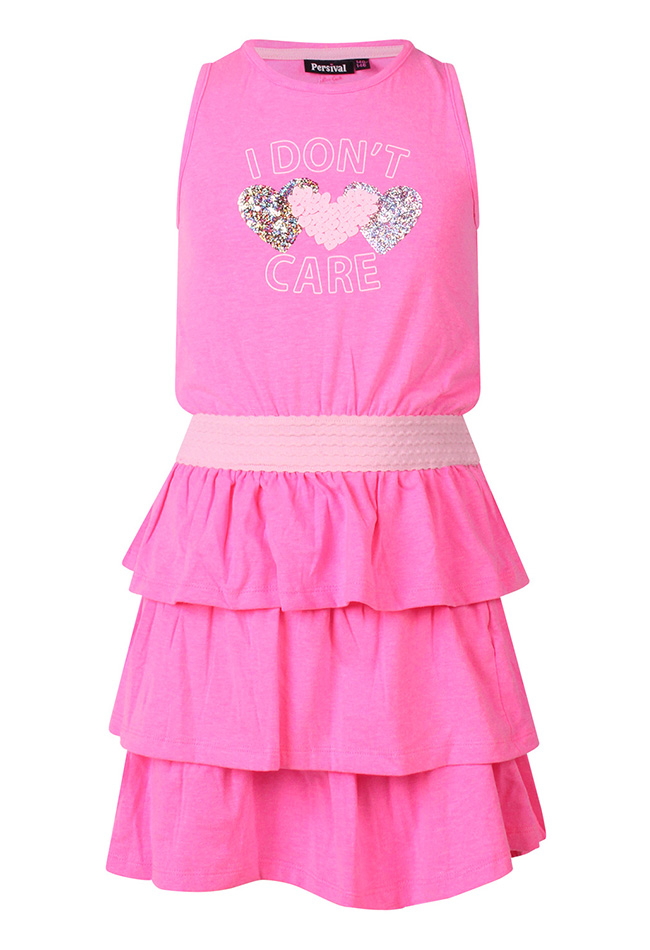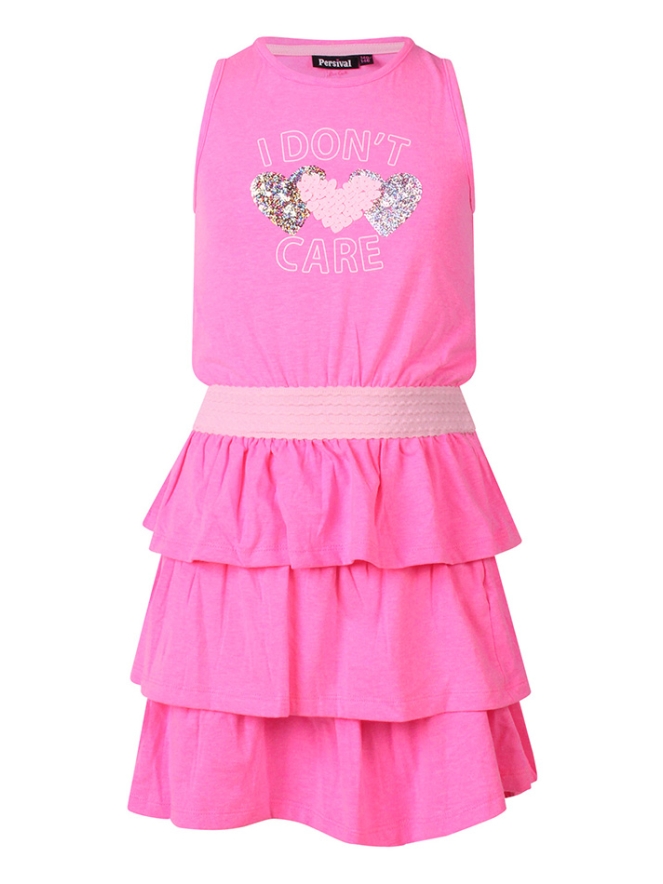 Dit mouwloze jurkje is uitgevoerd met een vrolijk strokenrokje dat zorgt voor een zwierig en luchtig effect bij elke beweging. De opvallende tekst I donâ??t care is afgewerkt met glinsterende pailletten, wat het jurkje een trendy en eigenwijze uitstraling geeft.