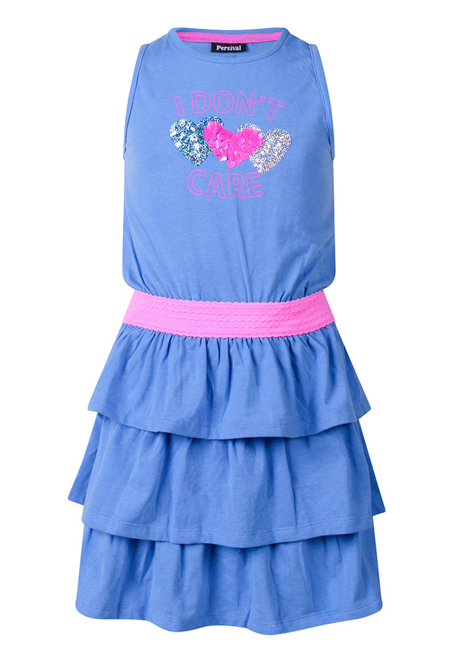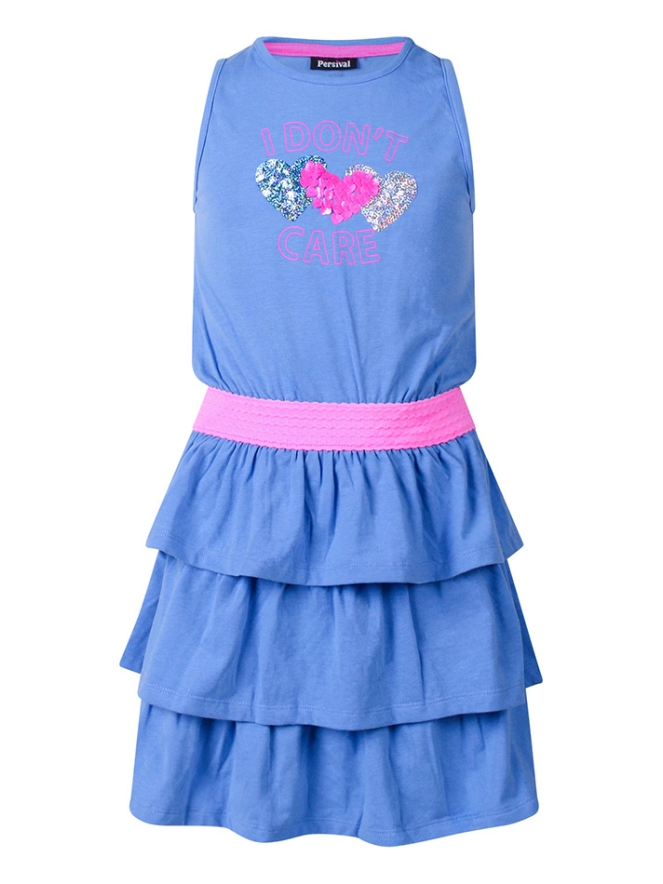 Dit mouwloze jurkje is uitgevoerd met een vrolijk strokenrokje dat zorgt voor een zwierig en luchtig effect bij elke beweging. De opvallende tekst I donâ??t care is afgewerkt met glinsterende pailletten, wat het jurkje een trendy en eigenwijze uitstraling geeft.