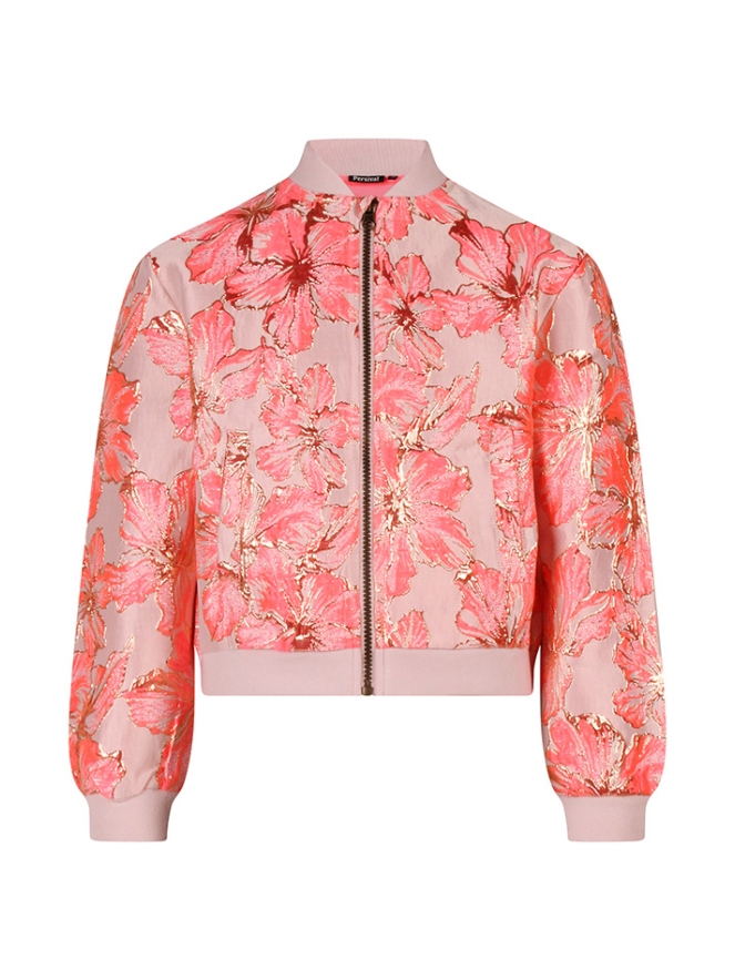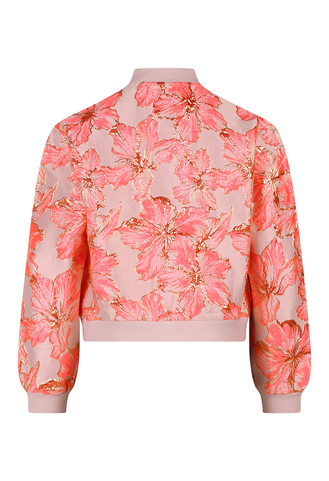 Dit meisjes bomberjack heeft een trendy bloem/lurex print en ribboorden voor een comfortabele pasvorm. Het bombermodel geeft een stoere, modieuze look en is ideaal om te combineren met een jeans voor een complete outfit.