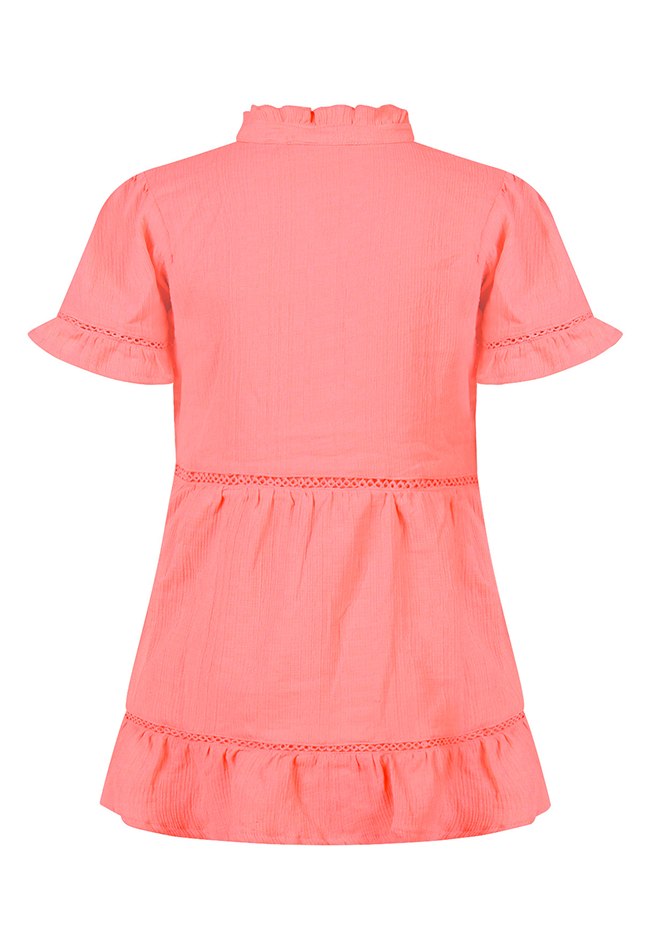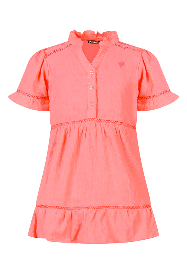 Deze meisjesjurk van Persival is perfect voor feestjes of zomerse dagen. Gemaakt van lichte mousseline voelt de jurk zacht en luchtig aan, ideaal voor actief speelplezier of een speciale gelegenheid. De jurk heeft een korte mouw, een V-hals en een speelse strokenrok met subtiele lace tape details, wat zorgt voor een trendy en zwierig effect bij elke beweging. Een klein hartje op de borst voegt een lief en opvallend detail toe. De lengte maakt hem ideaal voor warme dagen.