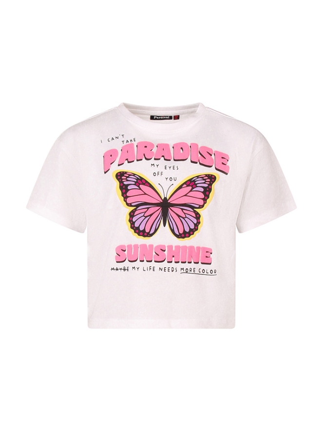 Dit meisjes T-shirt is een echte blikvanger. Op de voorkant prijkt de speelse vlinderprint, terwijl de tekst I can't take my eyes off you een vrolijke, charmante touch geeft. Met dit T-shirt straalt ze pure zomerenergie uit en trekt ze alle blikken naar zich toe, net als een echte sunshine girl! Een T-shirt dat elke outfit direct een zonnige, vrolijke vibe geeft.