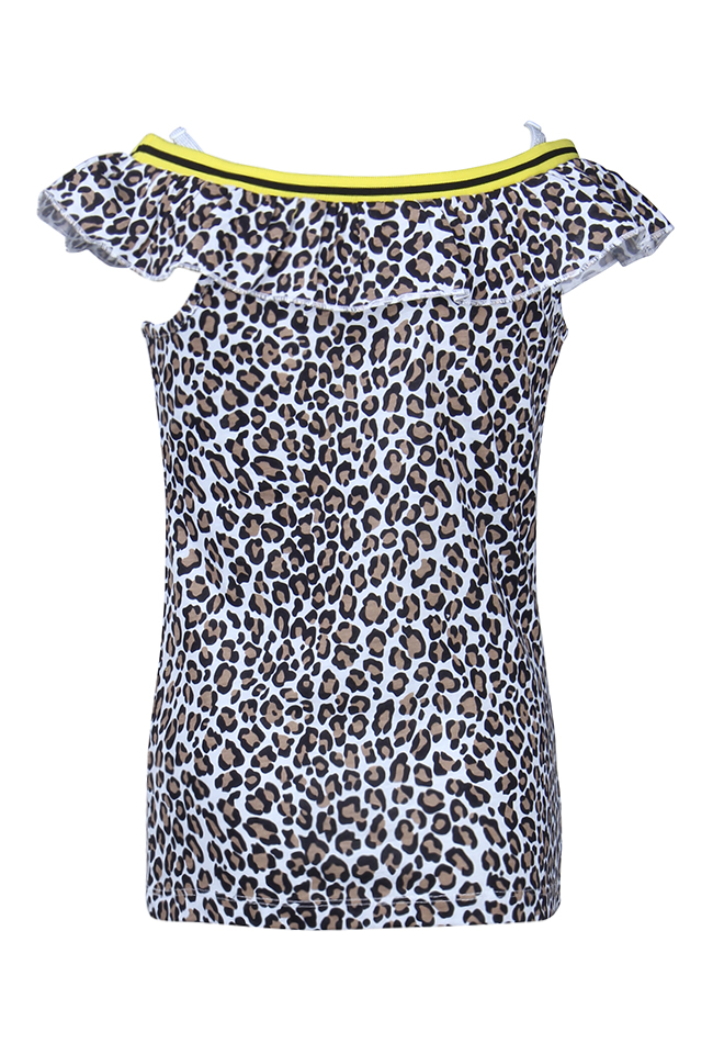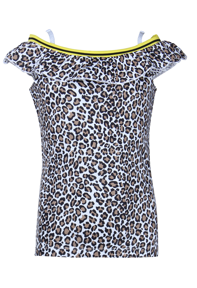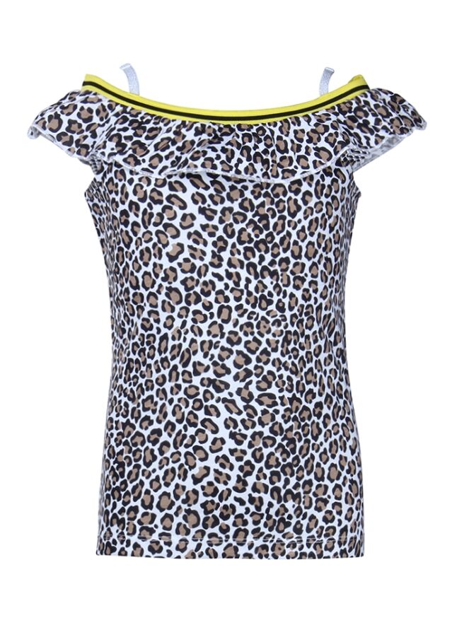 Off the shoulder jurkje van Persival. Het jurkje heeft glitter spaghetti bandjes, het off the shoulder gedeelte heeft een ruche effect. Materiaal: 50% polyester, 50% katoen