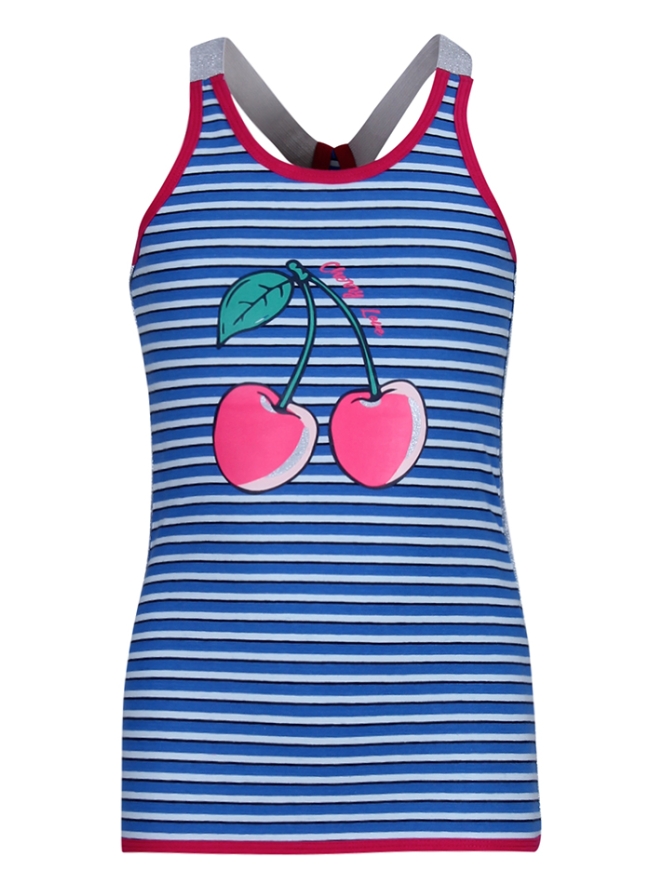 Gestreepte mouwloze top met print van Persival. De top heeft elastieken schouderbanden, een glitter streepje lang de zijkanten en een kersen print. Materiaal: 95% katoen, 5% elasthan