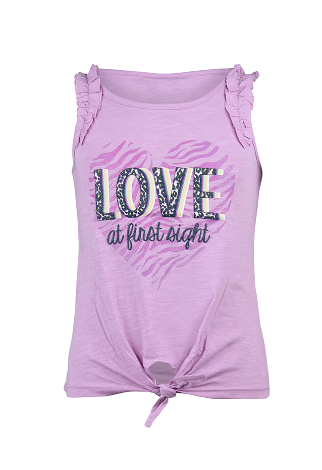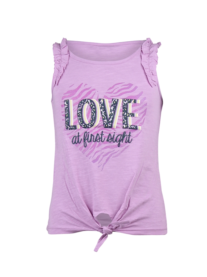 Hemd van Persival. Het hemd heeft ruche schouderbanden en is geknoopt aan de onderkant. Op de voorkant is een zebra print hart met een glitter tekst er op. Materiaal: 100% katoen. Wassen op 30 graden, niet bleken, niet in de droger, kan gestreken worden (print niet)