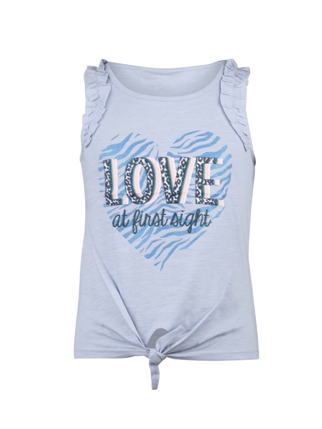 Hemd van Persival. Het hemd heeft ruche schouderbanden en is geknoopt aan de onderkant. Op de voorkant is een zebra print hart met een glitter tekst er op. Materiaal: 100% katoen. Wassen op 30 graden, niet bleken, niet in de droger, kan gestreken worden (print niet)