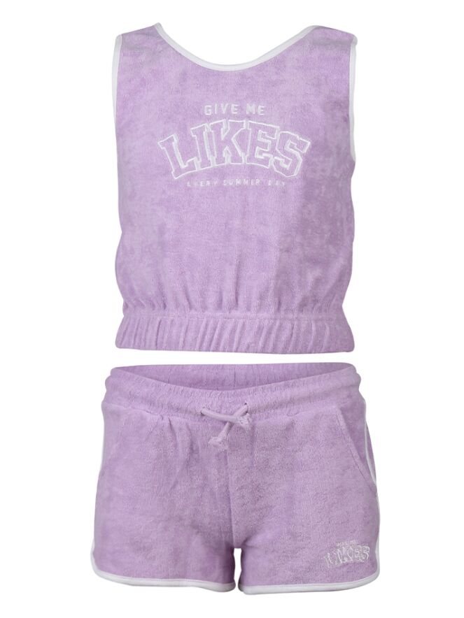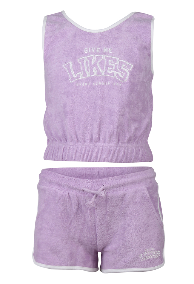 Setje van Persival. Het setje bestaat uit een hemd met tekst en een shortje. Beide zijn van badstof en hebben een sportieve look. De top heeft een elastieken band waardoor de top cropped is. Materiaal: 70% katoen, 30% elasthan. Wassen op 30 graden, niet bleken, niet in de droger, kan gestreken worden.