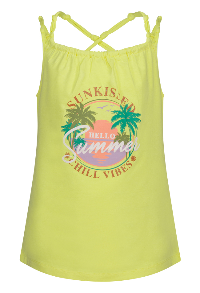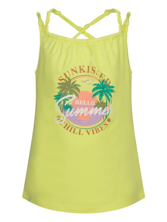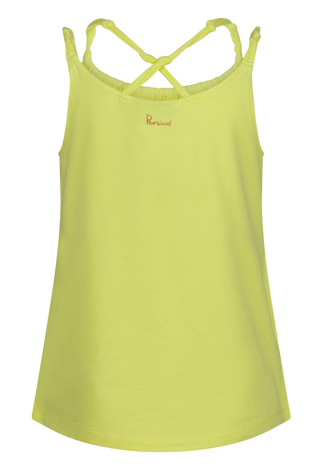Hemd van Persival. Het hemd heeft een ronde glitter zomerse print. De bandjes zijn geknoopt en gekruist. Materiaal: 95% katoen, 5% elasthan. Wassen op 30 graden, niet bleken, niet in de droger, kan gestreken worden.