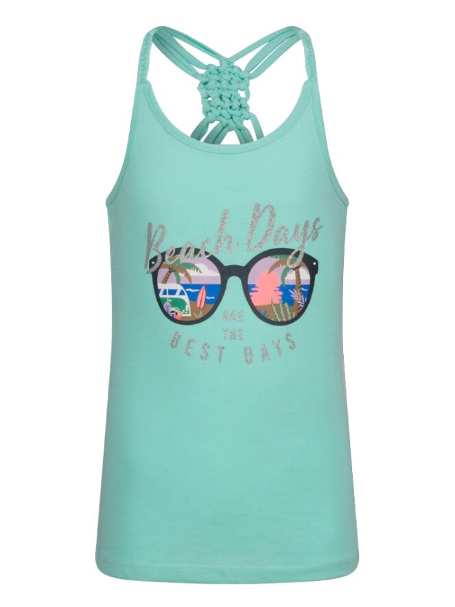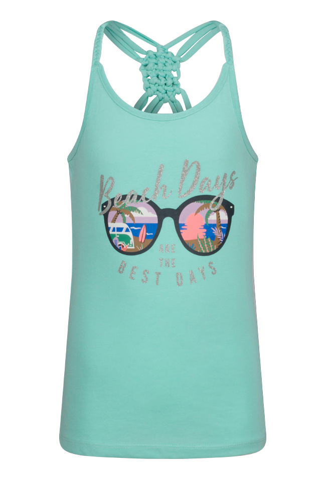 Hemd van Persival. Het hemd heeft een zomerse tekst print van een zonnebril en glitter letters. De bandjes zijn gevlochten. Materiaal: 50% katoen, 50% polyester. Wassen op 30 graden, niet bleken, niet in de droger, kan gestreken worden.