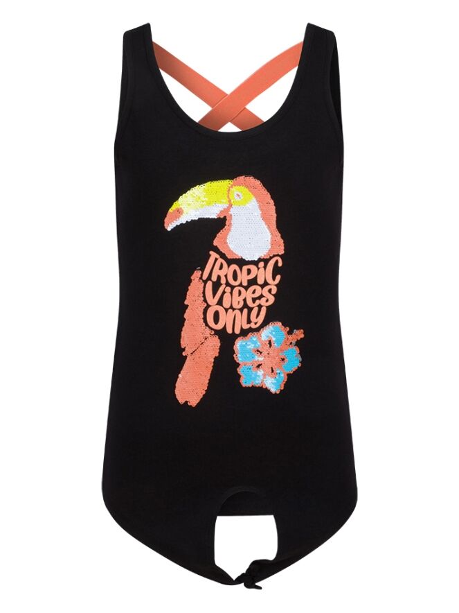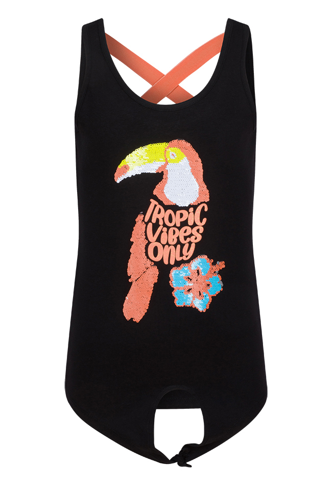 Hemd van Persival. Het hemd heeft gekruiste elastieken schouderbanden. Op de voorkant is een sequin vogel met tekst. De onderkant van het hemd heeft een knoop. Materiaal: 65% polyester, 30% katoen, 5% elasthan. Wassen op 30 graden, niet bleken, niet in de droger, kan gestreken worden.