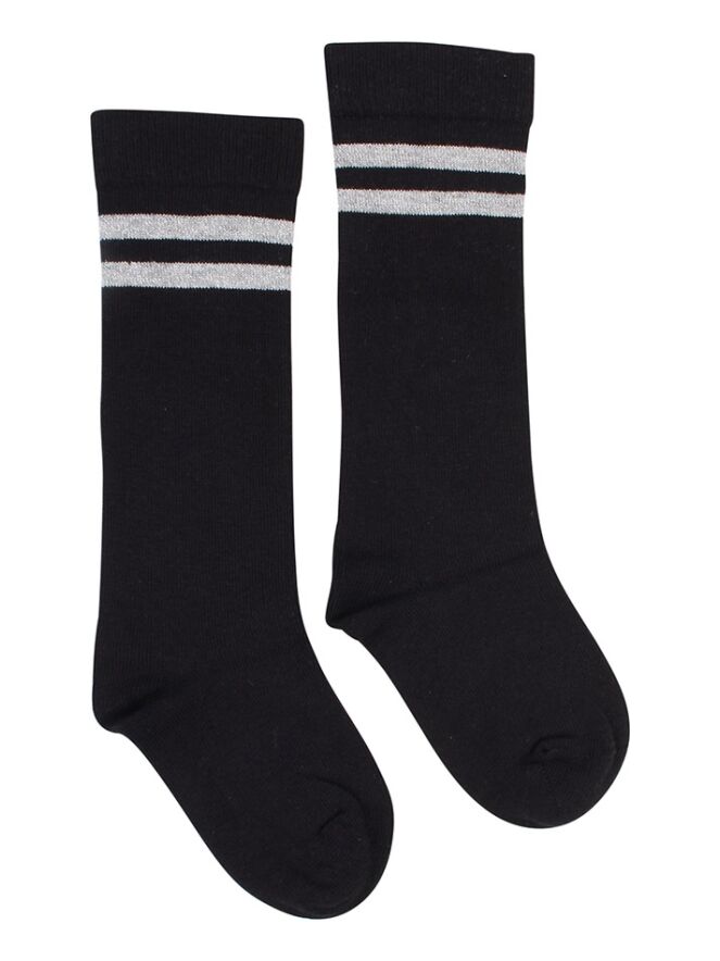 Kniekousen van Persival. 2 paar sokken met dubbele glitter streep. Materiaal: 78% katoen, 20% polyamide, 2% elasthan. Wassen op 30 graden.