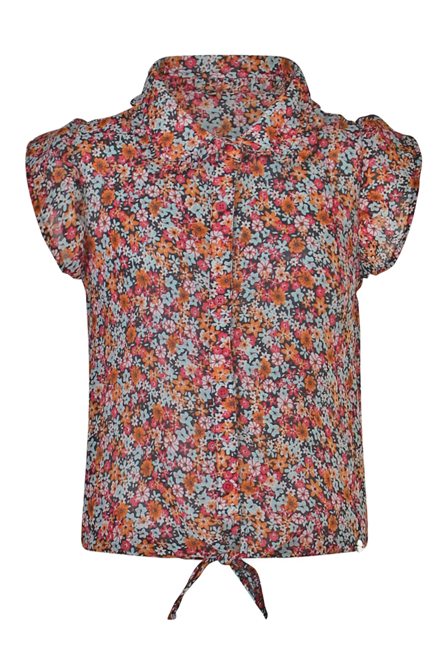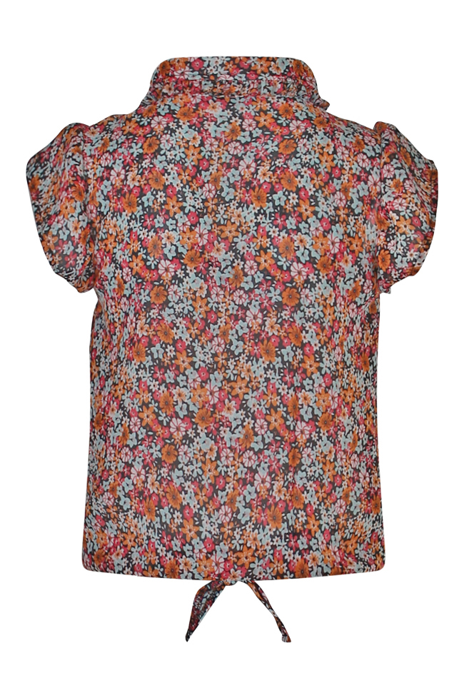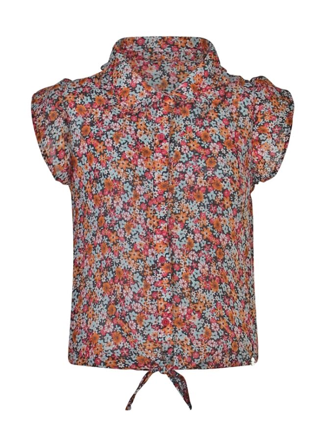 Blouse met korte mouwen een allover bloemenprint en op de voorkant een rondekraag met ruche en knoopdetail aan de onderkant.