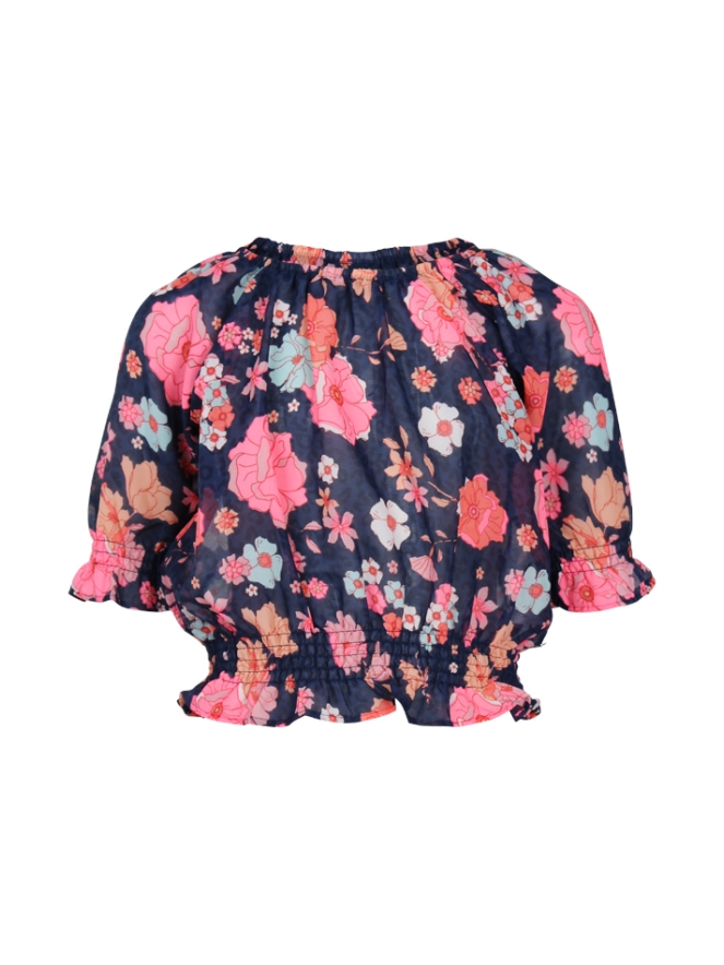 Korte top met korte mouwen een allover retrobloemenprint en een smockband aan de onderkant.