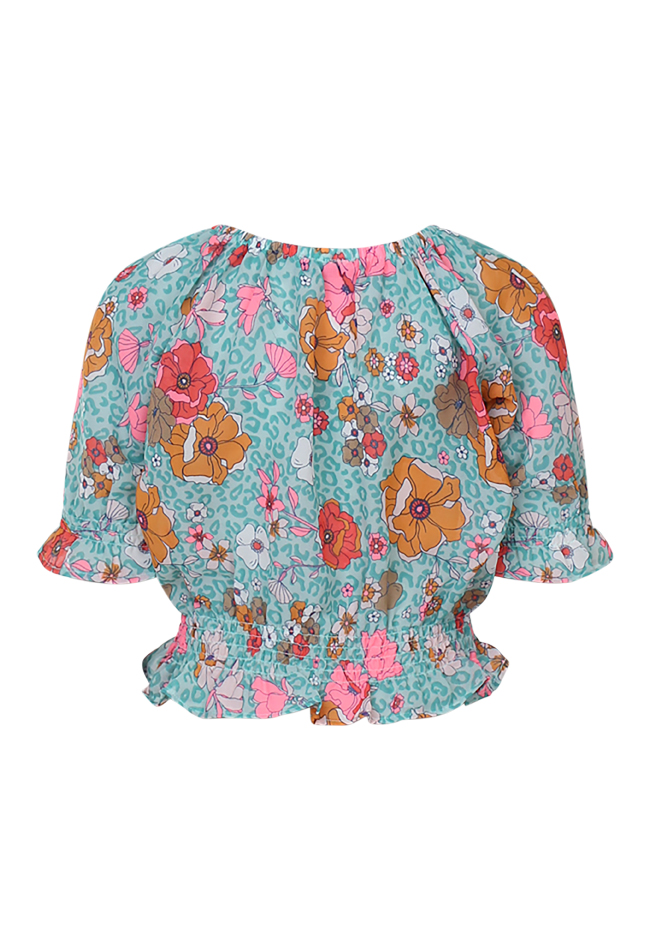 Korte top met korte mouwen een allover retrobloemenprint en een smockband aan de onderkant.